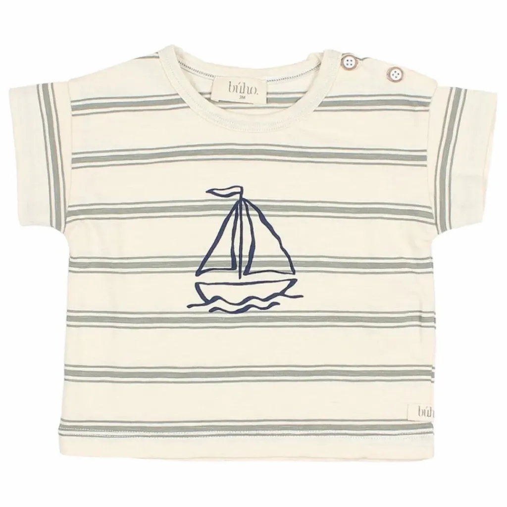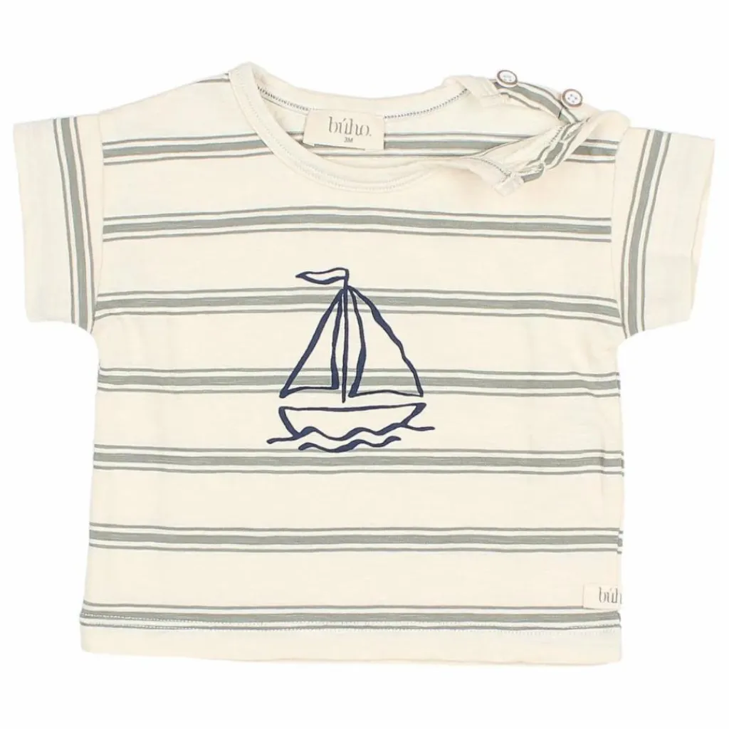 - T-shirt rayé avec impression sur le devant. Col rond avec fermeture à bouton sur l’épaule. Manches courtes.