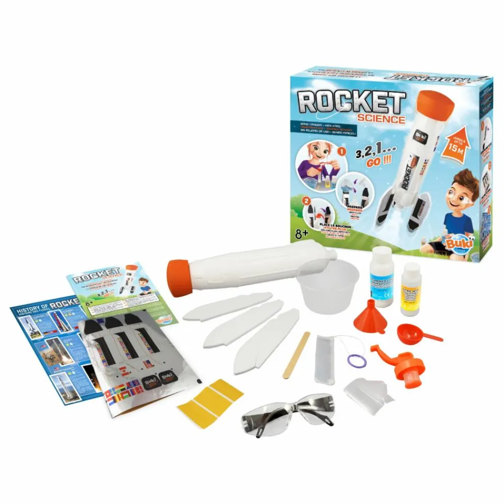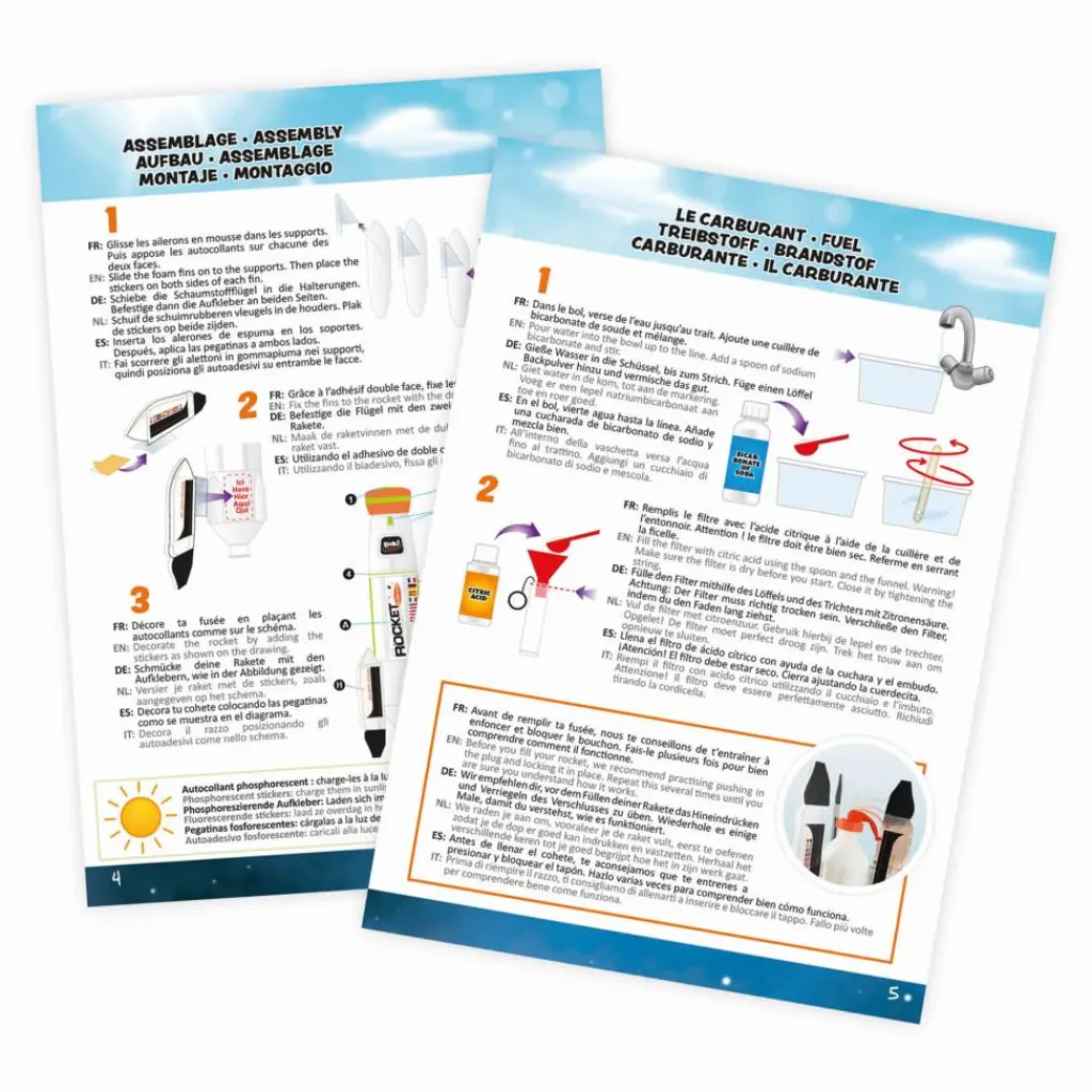 - 1 fusée, 1 bouchon de sécurité, 1 filtre, 3 ailerons en mousse, 3 supports pour ailerons, des adhésifs double face, de l’acide citrique, bicarbonate de soude, cuillère mesure, mélangeur, entonnoir, bol, autocollants, poster, lunettes de protection.