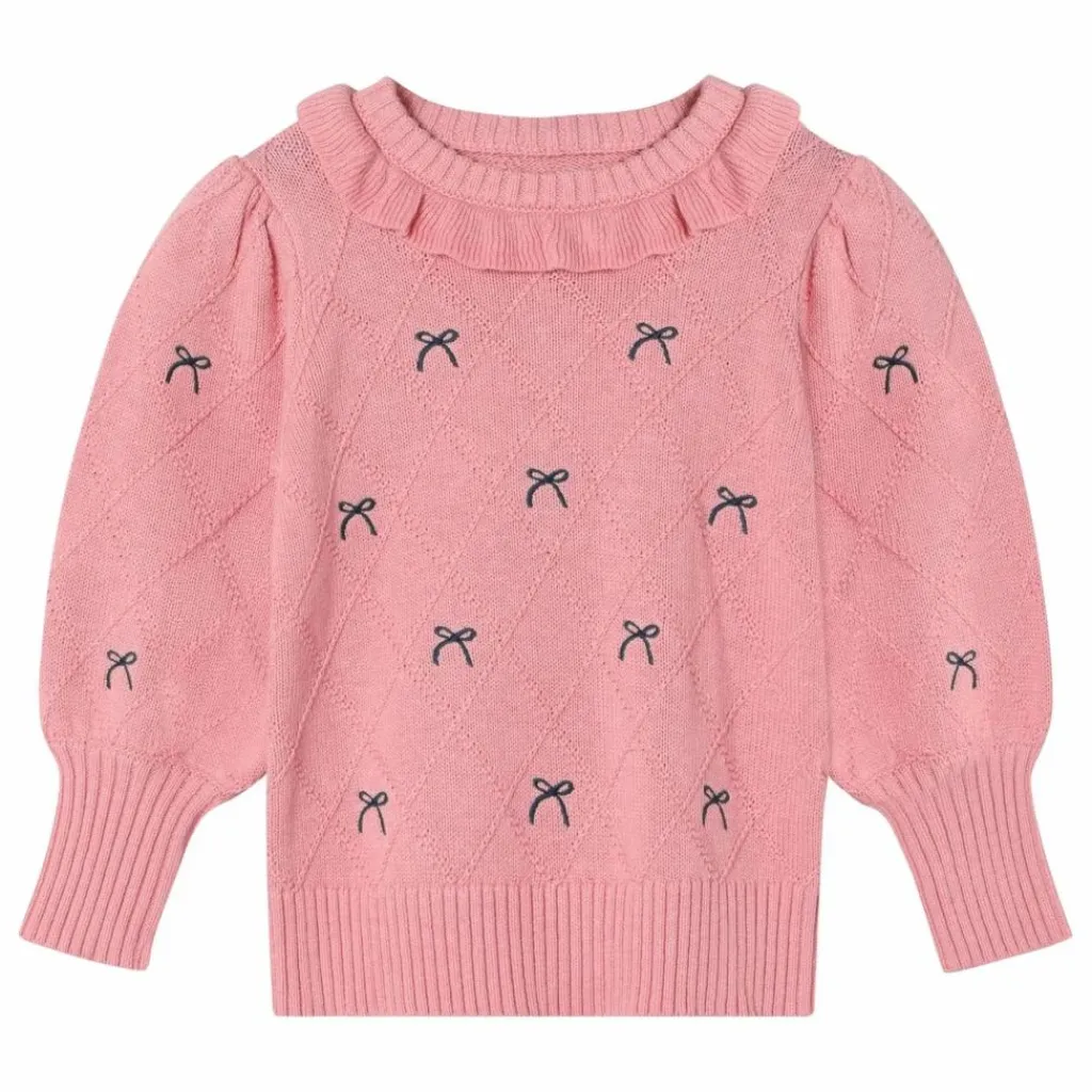 - Pull-over tricoté de qualité douce avec un motif arlequin sur tout le corps, créant une belle profondeur. Des nœuds brodés se trouvent dans les panneaux des deux manches et sur le devant et le dos. Le chemisier a une manche bouffante avec des plis à l’épaule et un bord côte haut au poignet. L’encolure est ronde, et le long du bord côte, un col ajoute un joli détail.