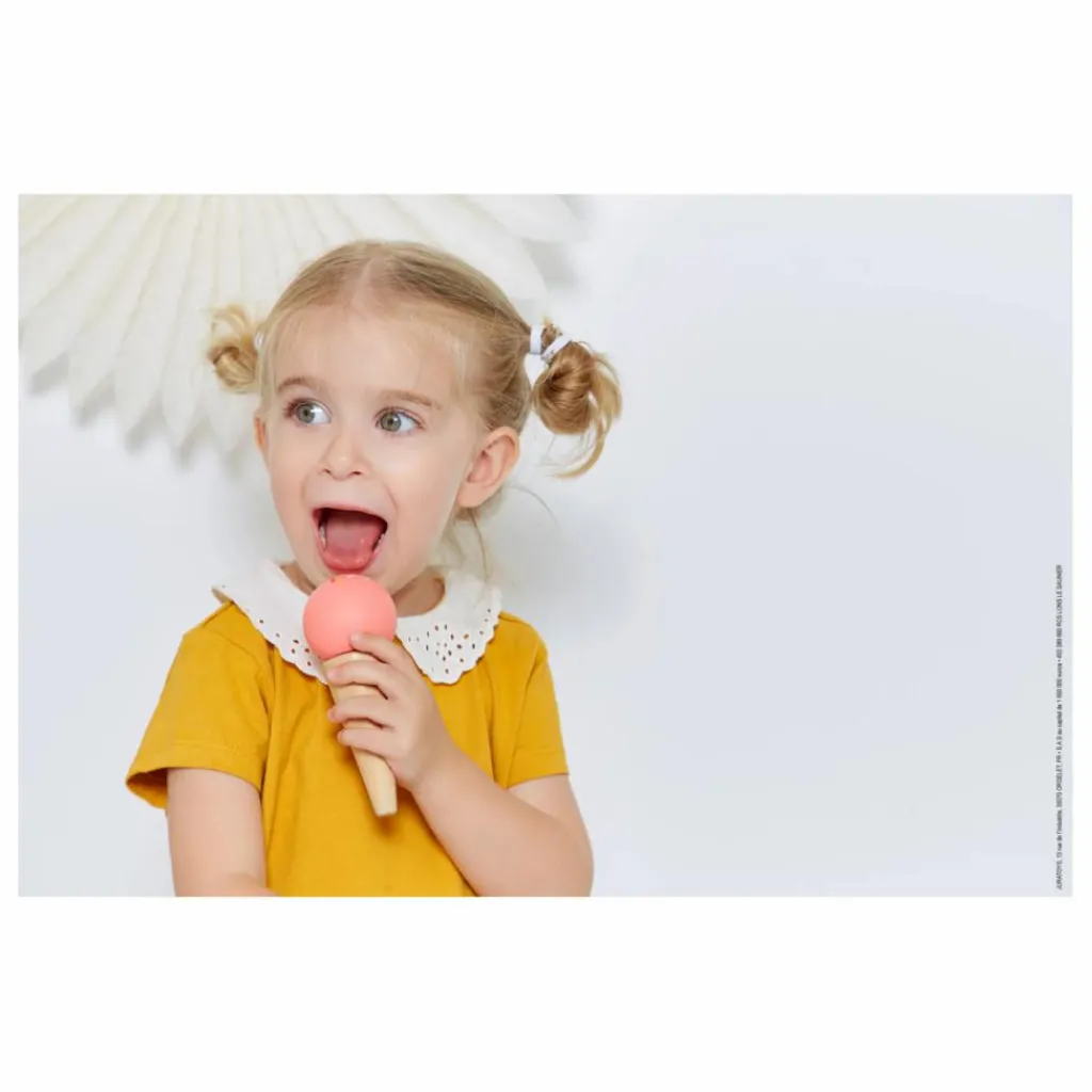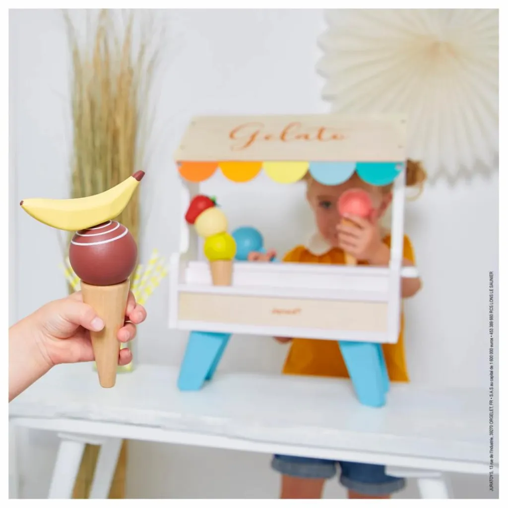 - 14 accessoires dont 3 cônes, 6 boules de couleurs différentes, des fruits, 1 crème chantilly, 1 cuillère