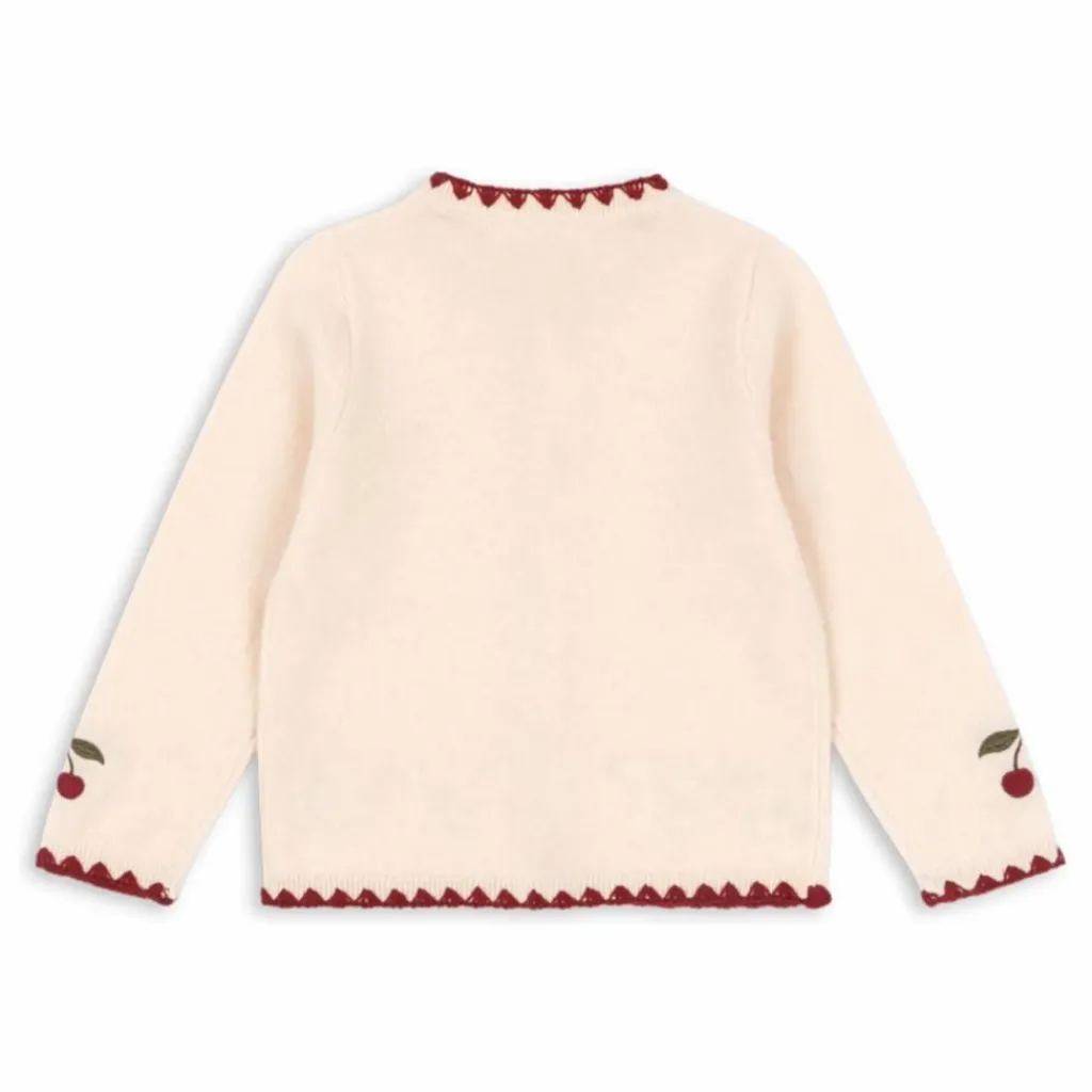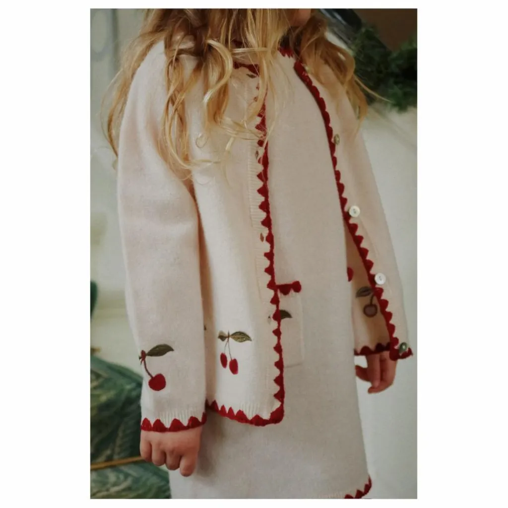 - Un cardigan en maille d’une douceur exceptionnelle, orné d’une délicate broderie cerise et d’un tissu contrasté sur les bords. Fermeture par des boutons en nacre sur le devant.