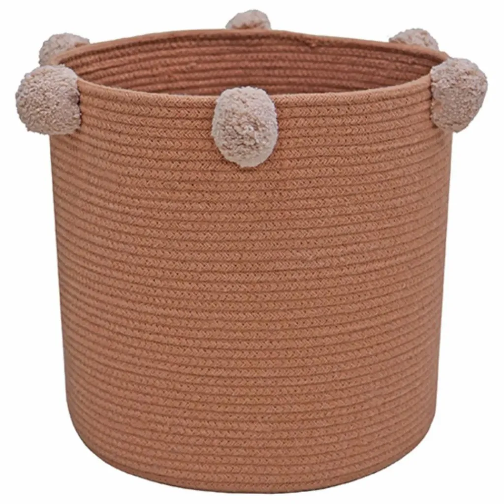 - Panier en cordon de coton tressé de couleur bleu sauge et fini avec 6 pompons en coton marron