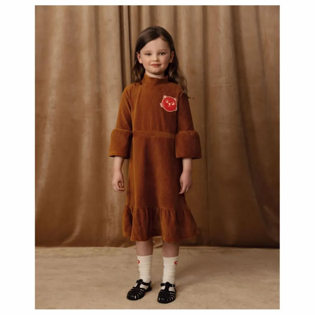 - Robe en velours côtelé, fabriquée à partir de coton biologique et de polyester recyclé.