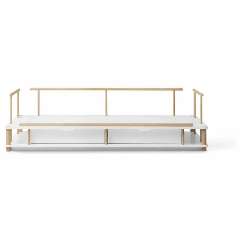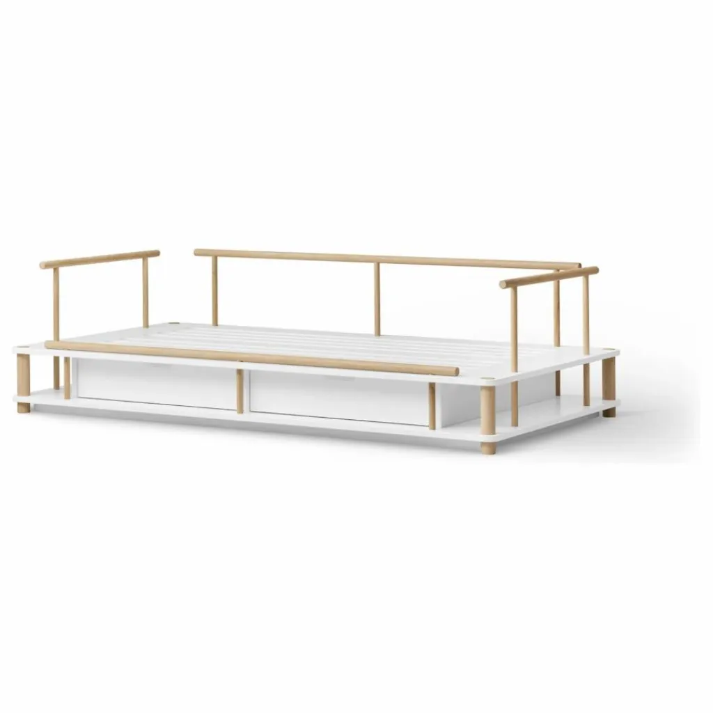 Le lit banquette Camp accompagne les enfants dès 3 ans jusqu’à l’adolescence. Son design bas, avec barrière et traversin optionnels, assure confort et sécurité pour les plus petits. Ses dimensions généreuses permettent aux parents de rassurer leur enfant durant la nuit. Doté d’accoudoirs bas, d’un dossier en rondins de chêne, de vis dissimulées et de tiroirs de rangement pratiques, ce lit peut être décoré de coussins et plaids pour créer un espace cosy et stylisé. Fonctionnel et esthétique, il s’intègre parfaitement dans une chambre d’enfant.
