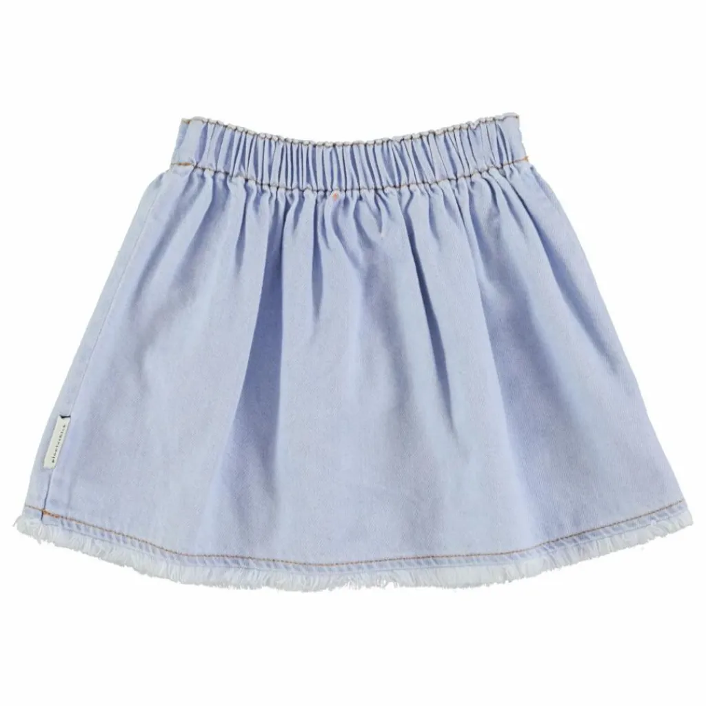 - Jupe courte en denim souple, croisée sur le devant et bordée de franges.