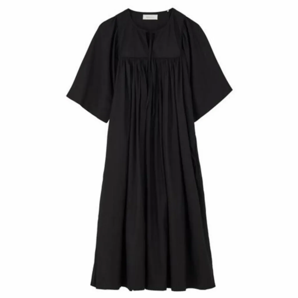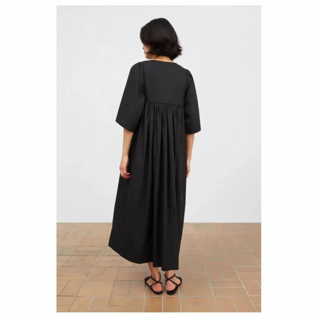 - D’une coupe SKALL classique, cette longue robe légère en coton biologique est légèrement évasée et froncée par de petits plis sur le devant et dans le dos, avec des bords passepoilés. Les manches coudées ajoutent à la silhouette et une bande de tissu autoagrippante permet de la fermer au niveau du cou.