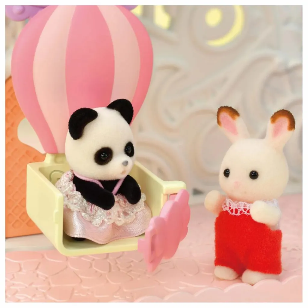 - 1 figurine bébé lapin crème, 1 figurine bébé panda, 1 figurine bébé chat persan, 1 parc d’attractions avec 1 socle et 1 toit château, 1 drapeau, 3 nacelles montgolfières, 1 nacelle fusée, 1 nacelle bateau, 2 wagons, 1 étoile filante, 1 vague