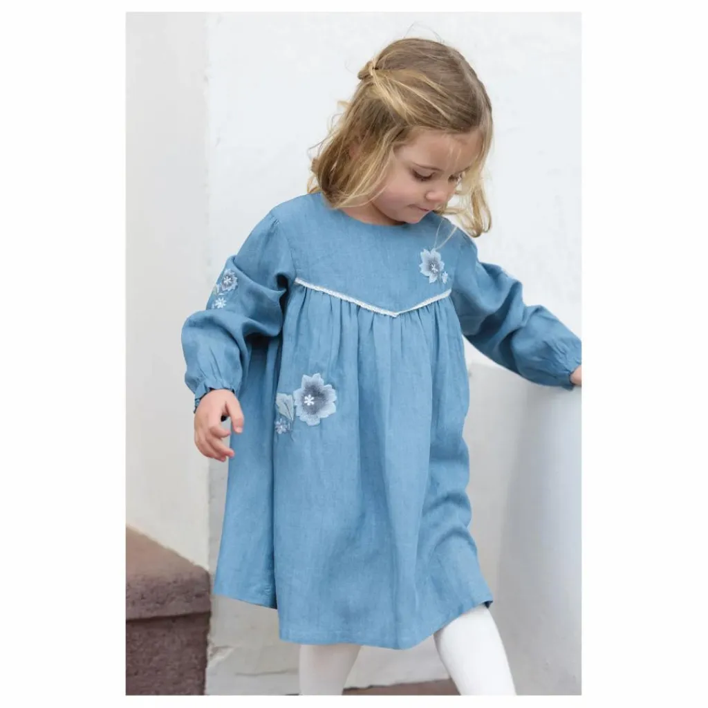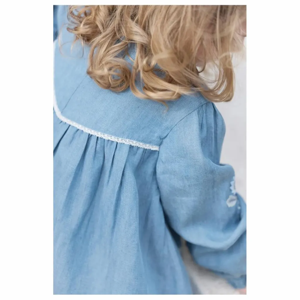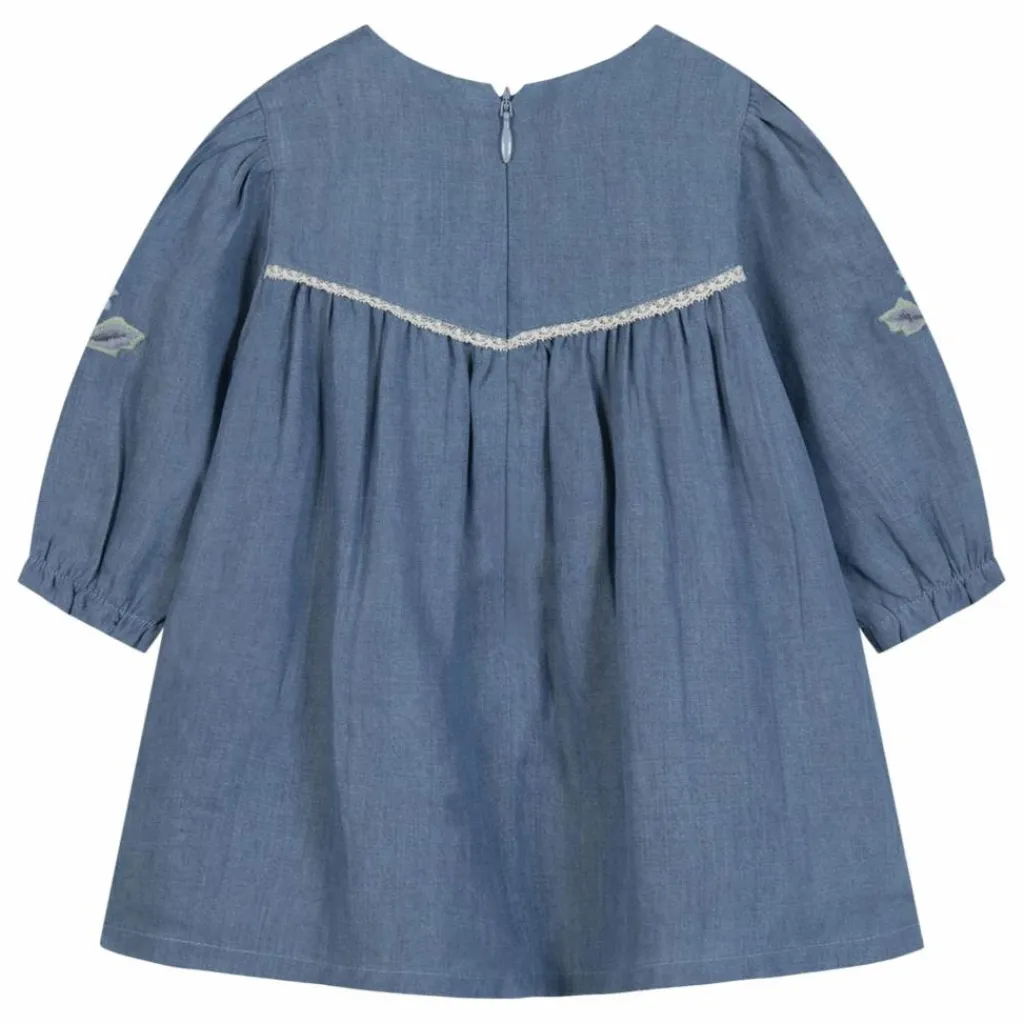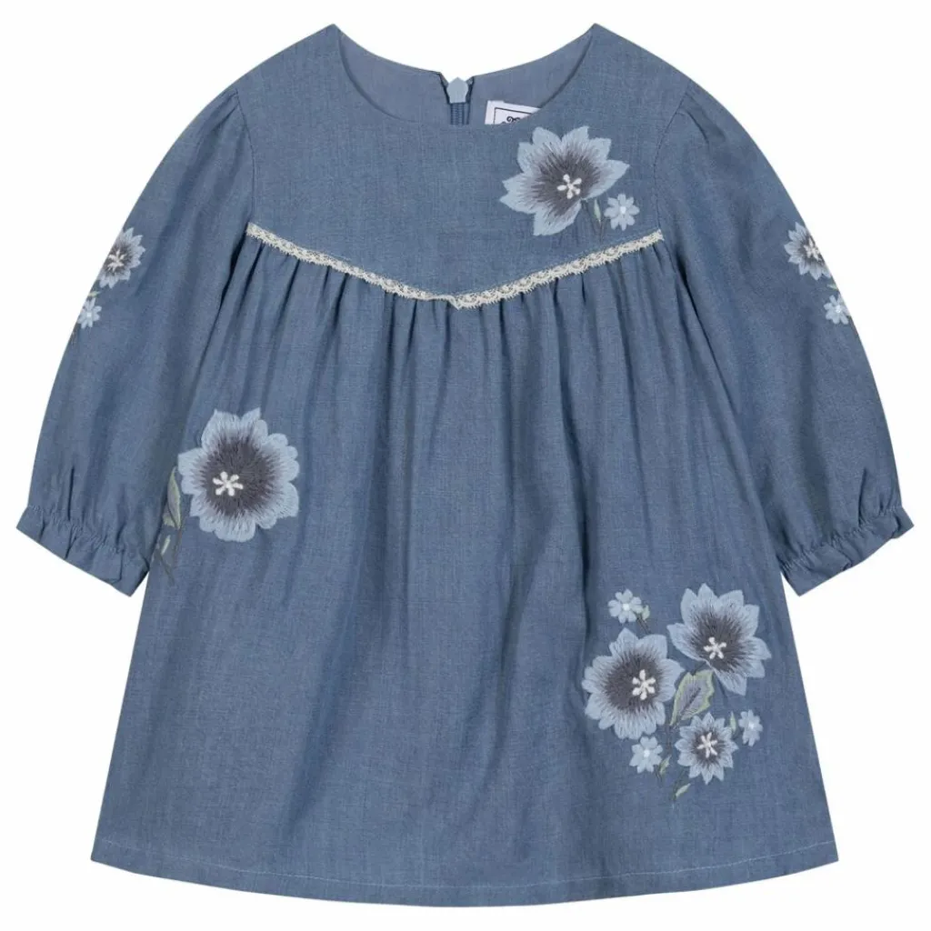 - Cette robe pour bébé fille, en coloris chambray, séduit par son style délicat et intemporel. Conçue avec un col rond et des manches resserrées, elle est sublimée par des broderies fleuries placées avec soin. Parfaite pour la saison, elle allie confort et raffinement au quotidien.