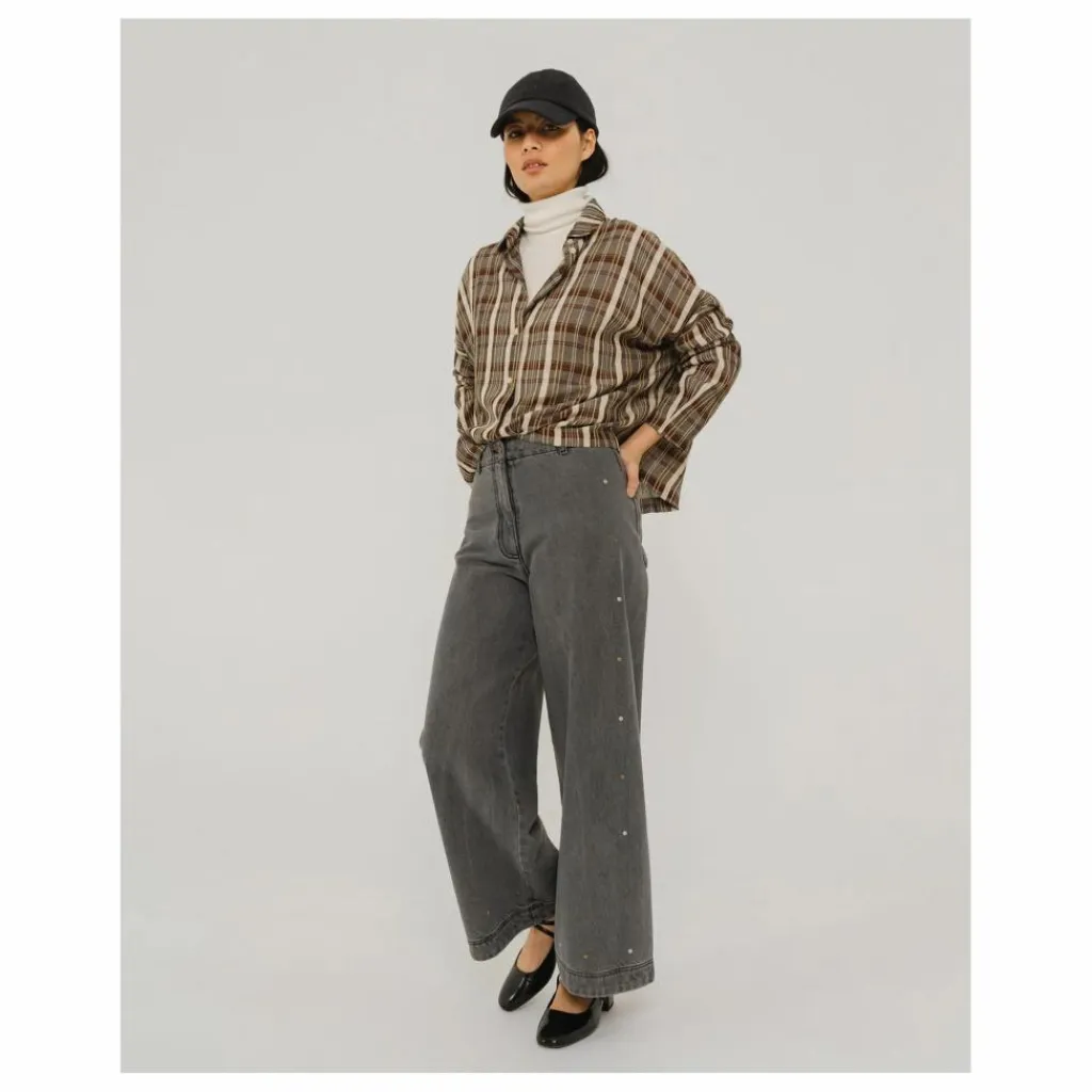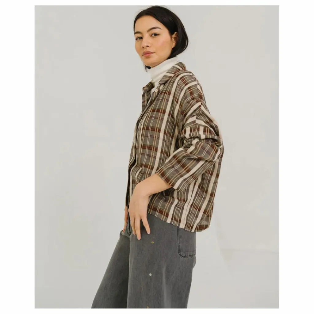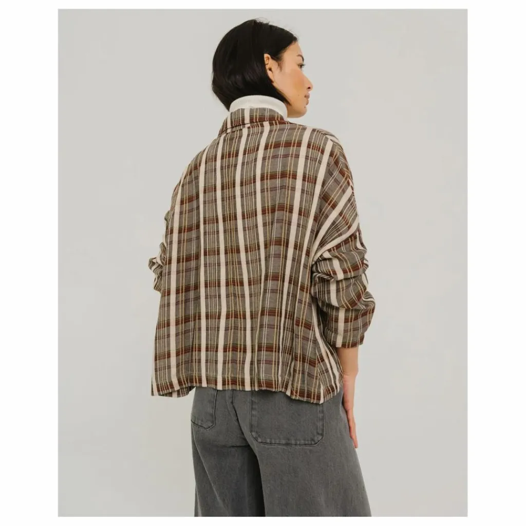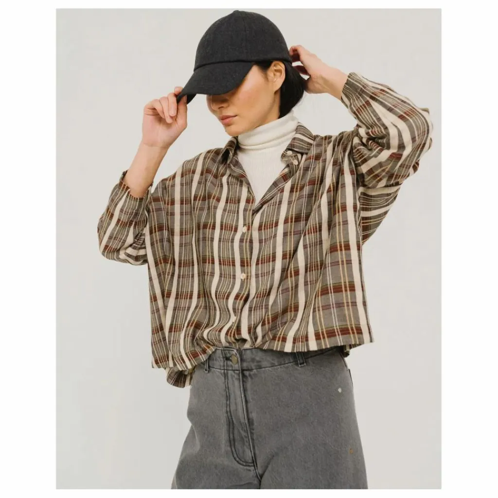 - WOOD est une chemise courte et « boxy fit » à col rond. Manches longues sans poignet, plis sur le bas de manches Fermée sur le devant par des boutons. Wood est coupée dans un carreau fin et fluide tissé en Italie