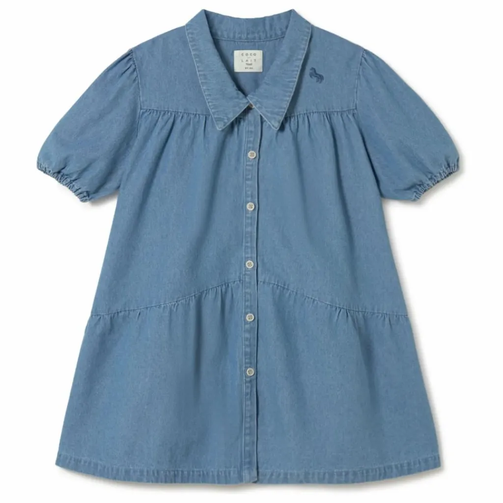 - Robe à col classique, fermeture boutonnée sur le devant, manches ballon, broderie cheval sur la poitrine et décolleté avec détails froncés.