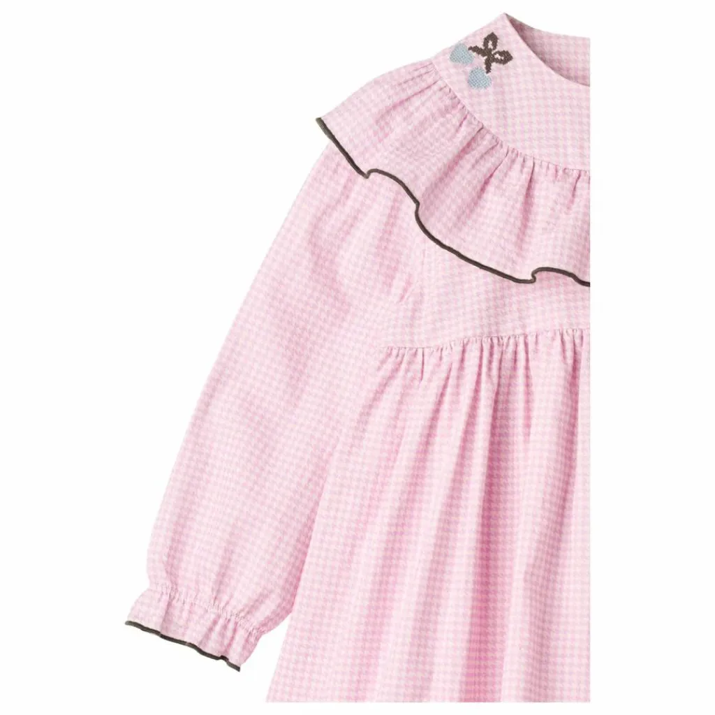- Cette robe a des volants au col et un beau motif sur le devant de la robe. La robe est fabriquée en 100% coton biologique