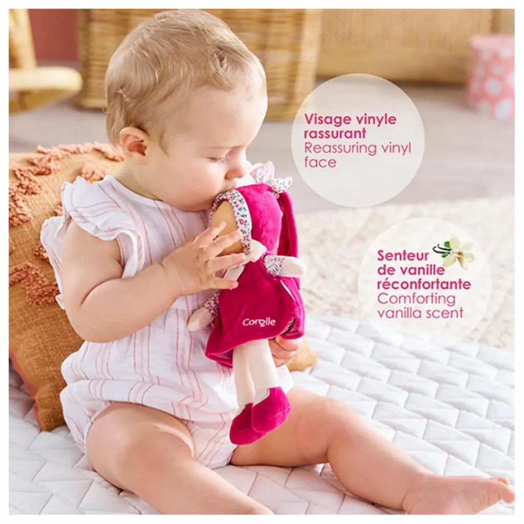 - Miss : le doudou incontournable. Visage vinyle rassurant. Senteur de vanille réconfortante. 25 cm. Dès la naissance.