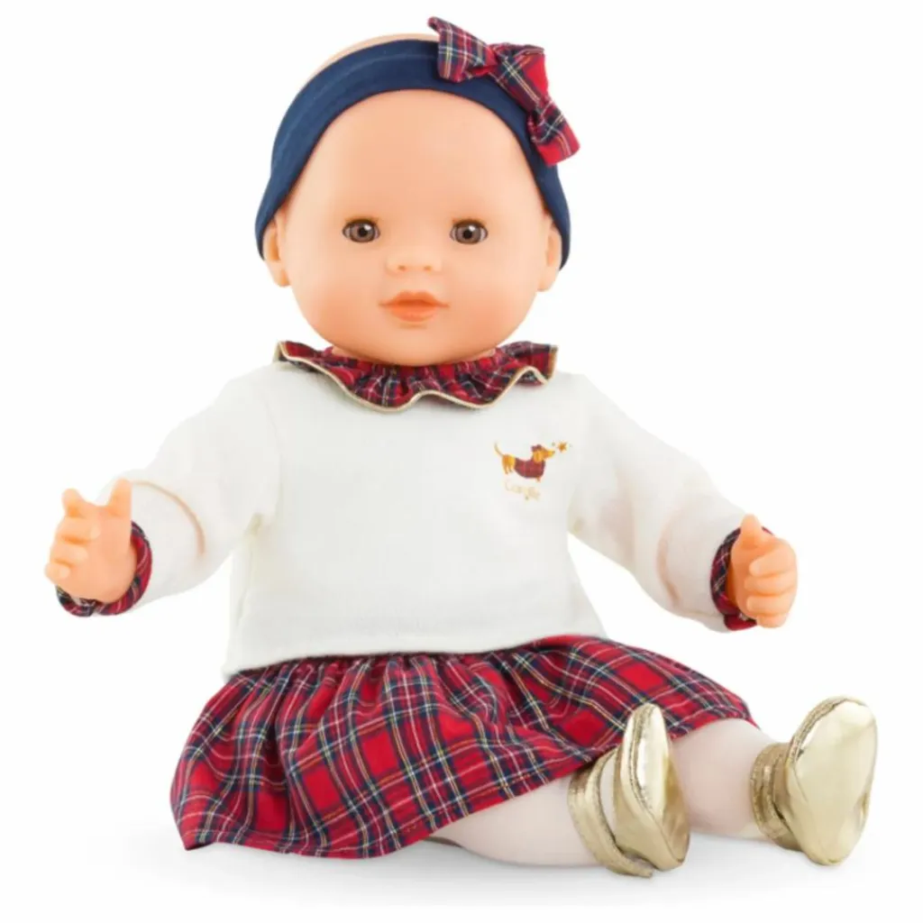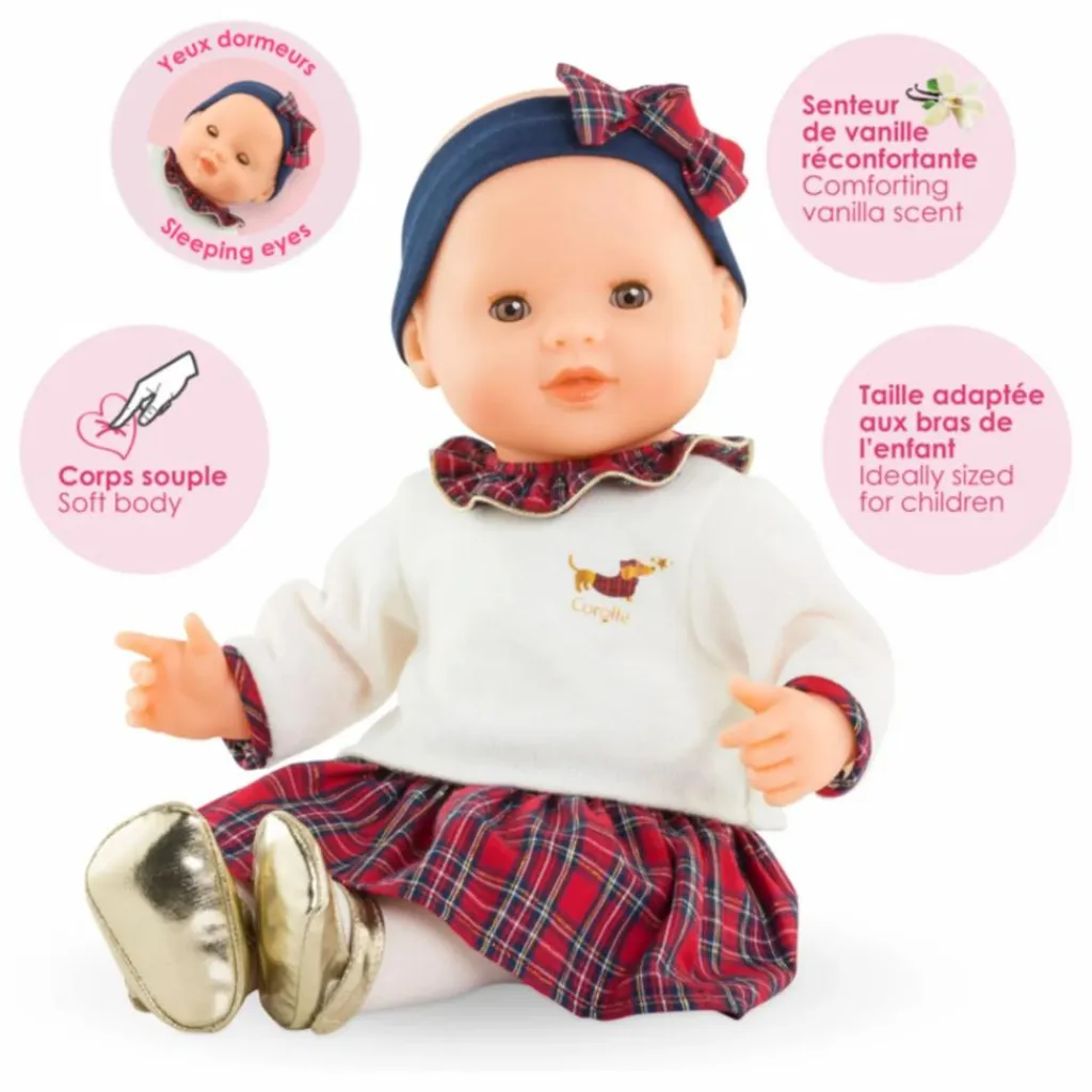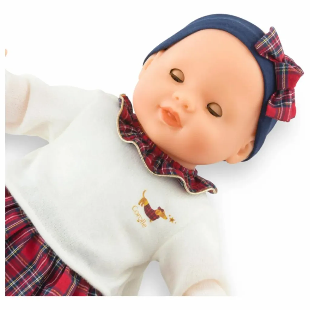 Suzanne Corolle en Fêtes est habillée pour les fêtes avec un ensemble composé d’un pull tricoté ivoire avec une collerette en tissu écossais bleu marine et rouge et d’une jupe aux motif écossais. Une sérigraphie pailletée d’un petit teckel en manteau écossais ajoute une note adorable à la tenue. Pour parfaire son style, Suzanne Corolle en Fêtes porte un collant et une paire de babies dorées, et elle est coiffée d’un bandeau bleu marine avec un nœud assorti à sa tenue.