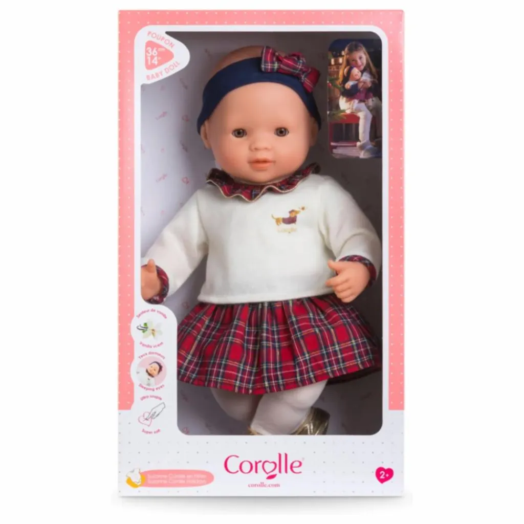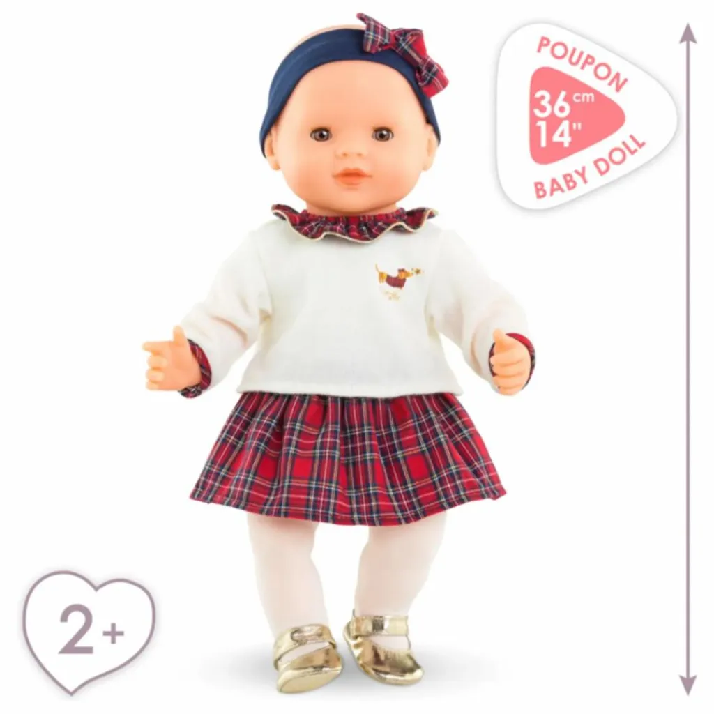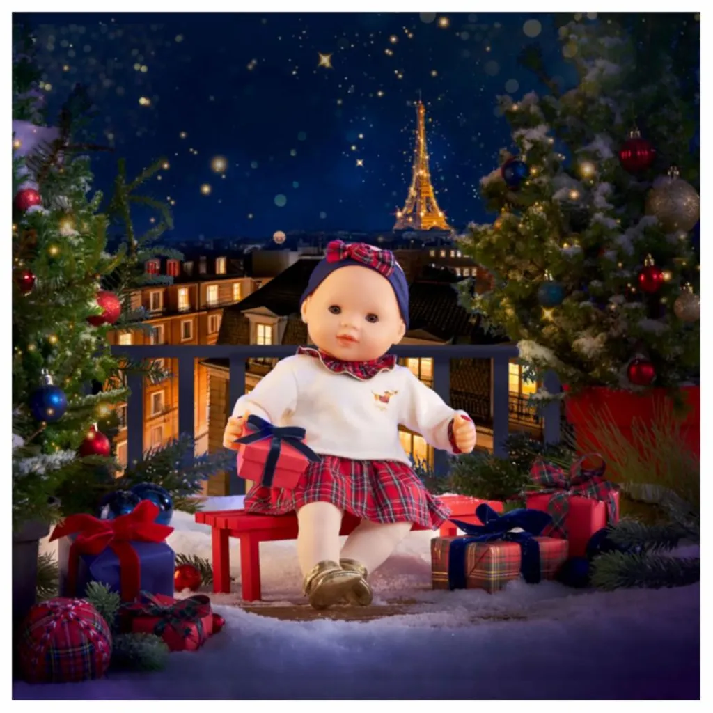 Suzanne Corolle en Fêtes est habillée pour les fêtes avec un ensemble composé d’un pull tricoté ivoire avec une collerette en tissu écossais bleu marine et rouge et d’une jupe aux motif écossais. Une sérigraphie pailletée d’un petit teckel en manteau écossais ajoute une note adorable à la tenue. Pour parfaire son style, Suzanne Corolle en Fêtes porte un collant et une paire de babies dorées, et elle est coiffée d’un bandeau bleu marine avec un nœud assorti à sa tenue.