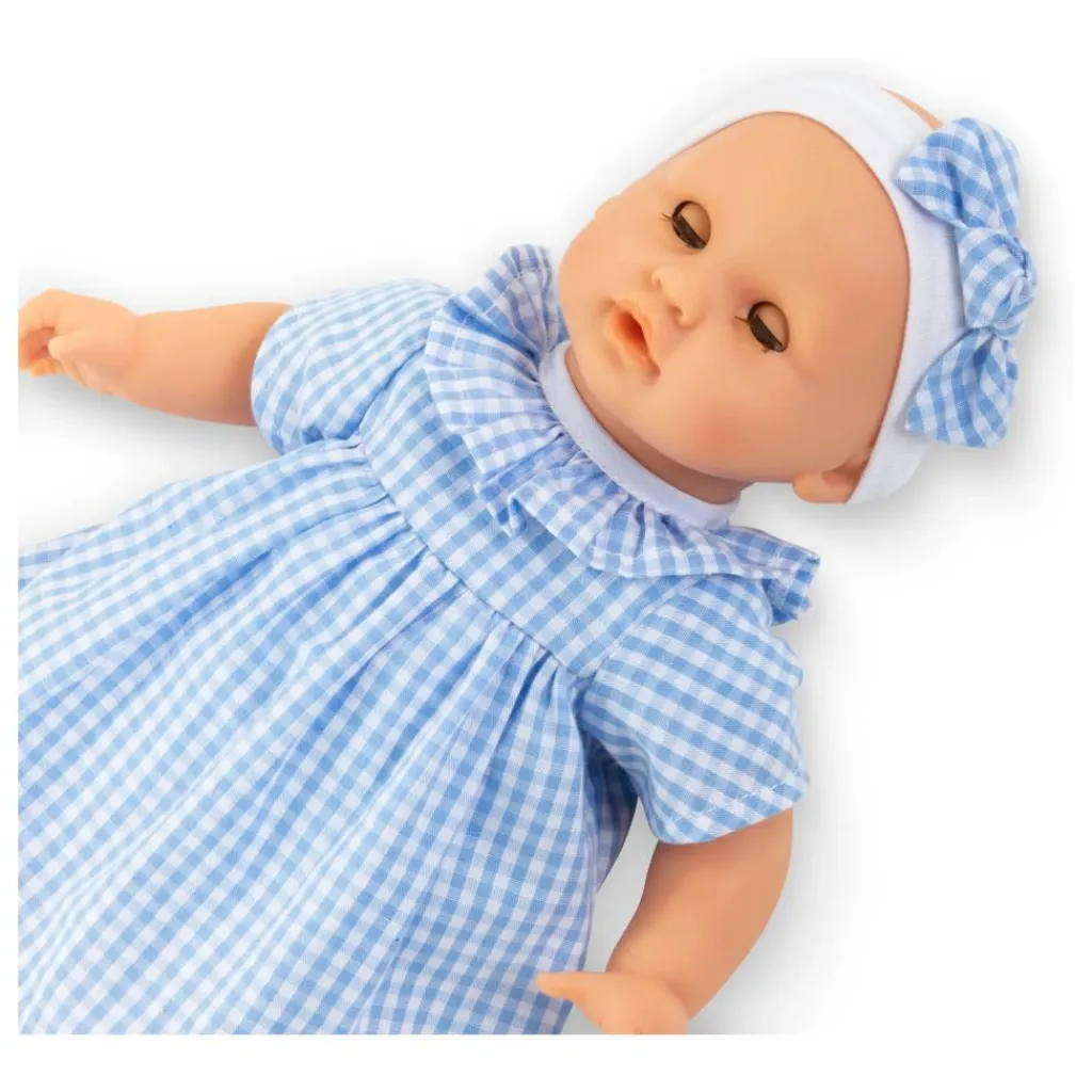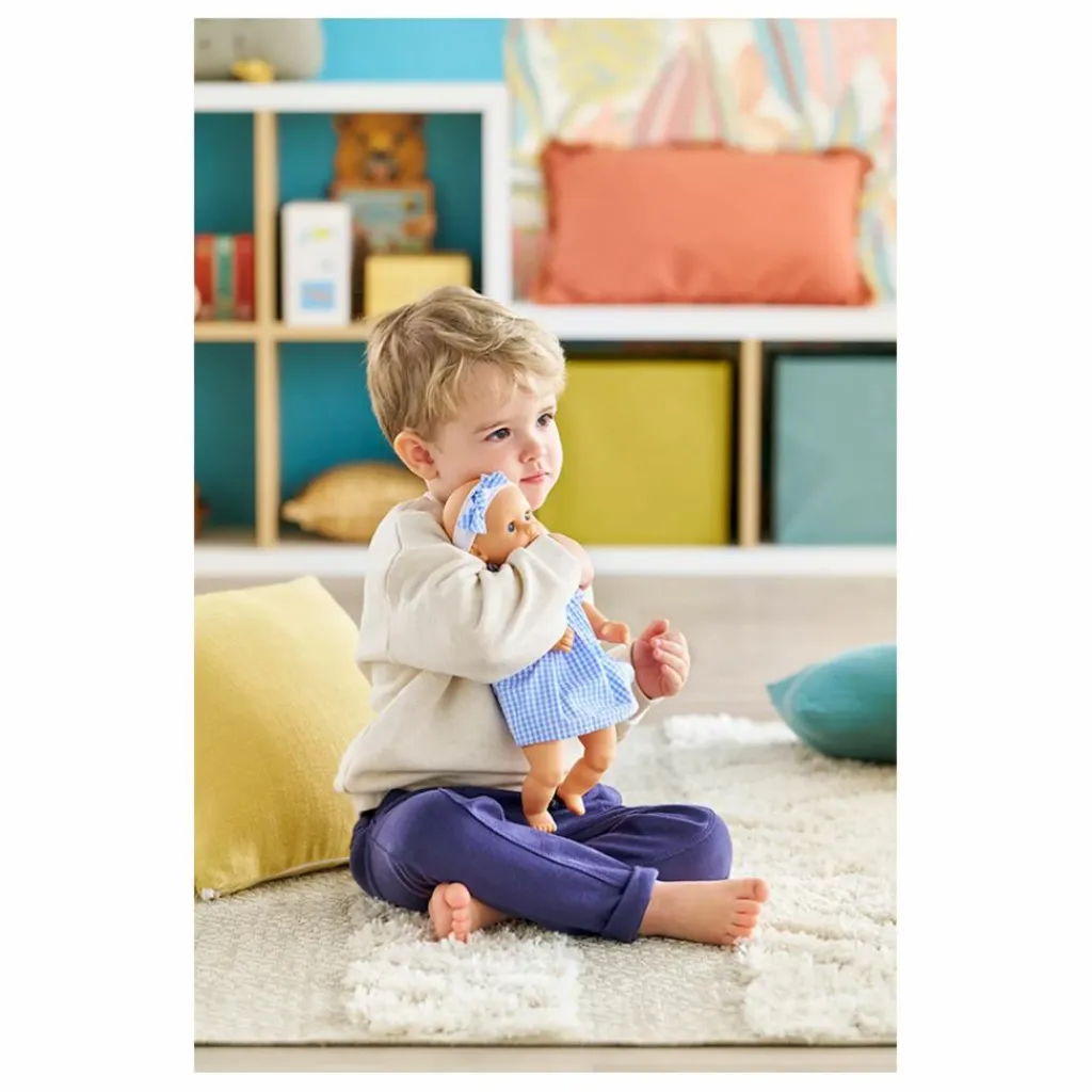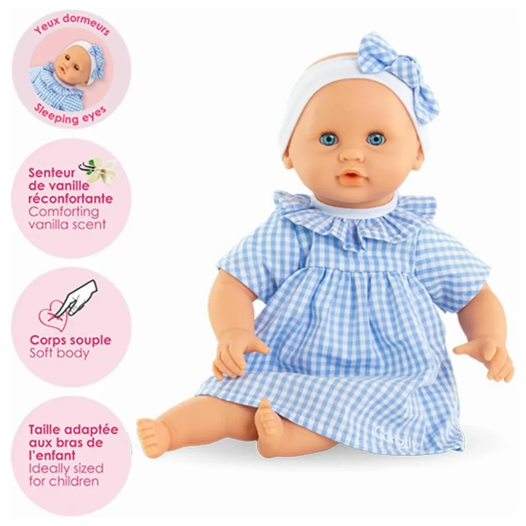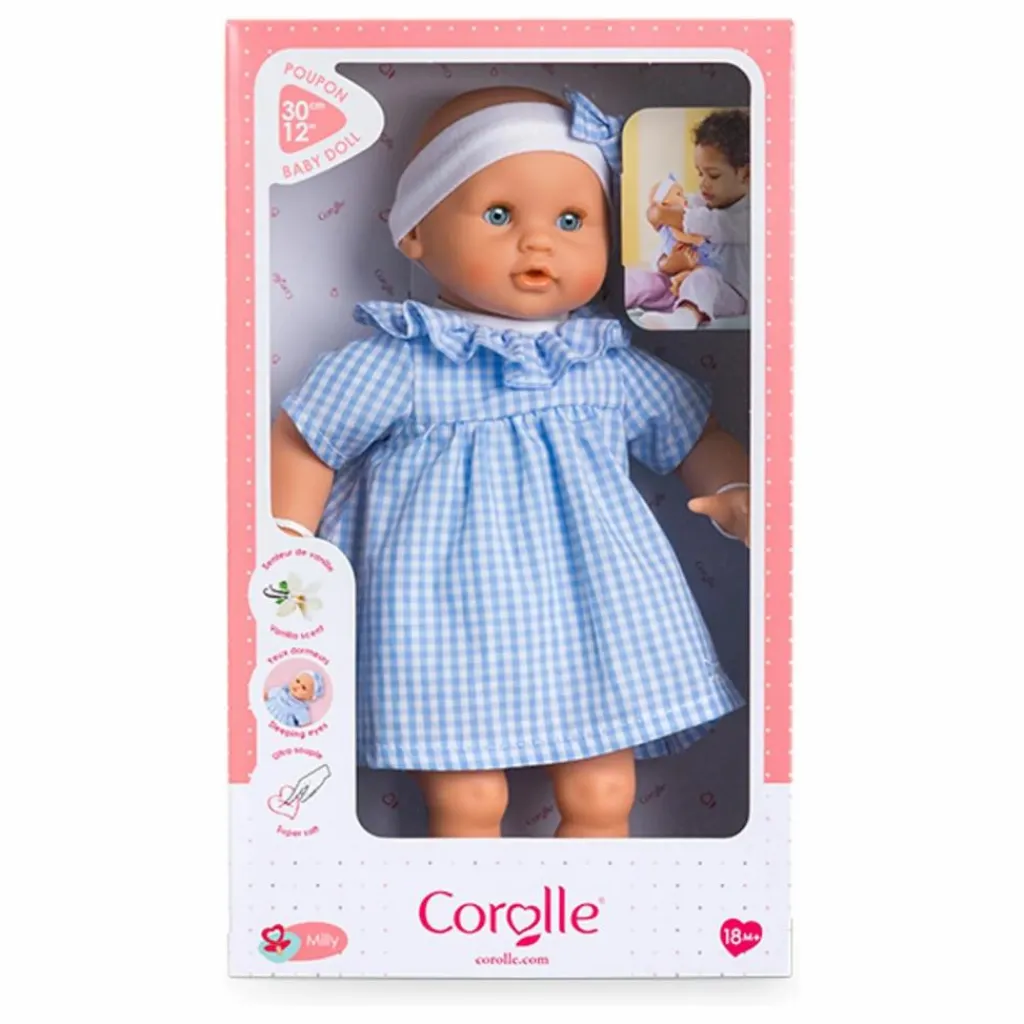 - Petit poupon de 30 cm. Prend et garde les attitudes d’un vrai bébé. Corps souple. Yeux dormeurs. Senteur de vanille. Dès 18 mois.