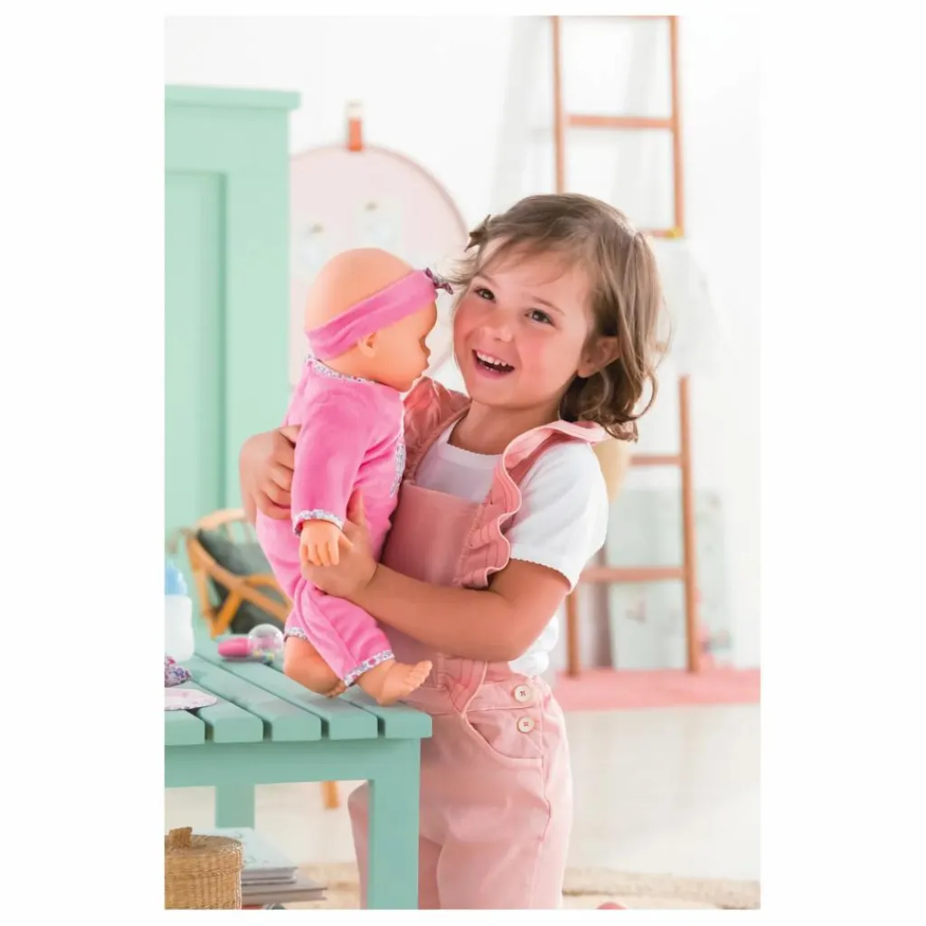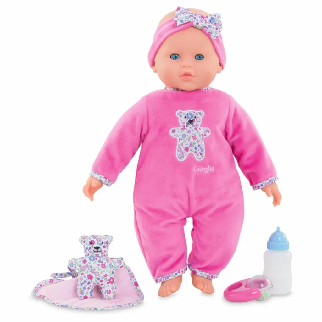 - Détails : Visage délicatement parfumé à la vanille., Adapté aux petites mains, Emet 20 sons différents et possède 8 fonctions :, gazouille quand on appuie sur sa main gauche, rit quand on appuie sur son pied gauche, éternue ou fait des vocalises quand on effleure son pied droit, tète (bruit de succion) quand on lui donne son biberon, fait son rot quand on lui tapote le dos après avoir pris son biberon, si elle pleure, on peut la calmer en approchant son doudou de son ventre pour qu’une berceuse se déclenche, ou en la berçant dans nos bras pour qu’elle s’endorme, fait le bruit du bisou quand on approche sa joue de la nôtre ou qu’on la lui caresse, Fonctionne avec 3 piles AA (LR6) non fournies, 1 poupon(s), 1 pyjama, 1 bandeau, 1 bavoir, 1 hochet(s), 1 petit doudou ours interactif, 1 biberon interactif