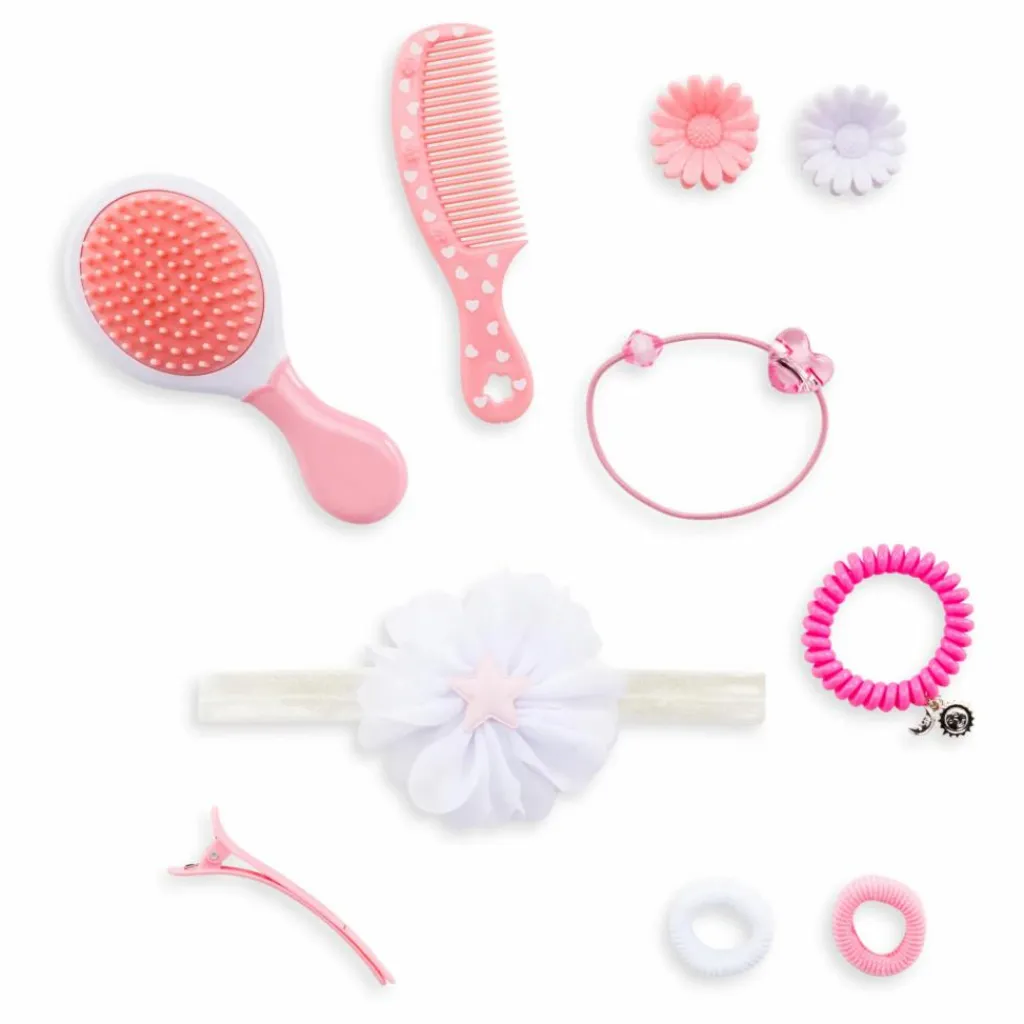 - 1 tête à coiffer, 1 bandeau élastique blanc avec 1 fleur, 1 brosse à cheveux, 1 peigne, 4 petites pinces à griffes, 2 grandes pinces à griffes, 2 pinces à cheveux plates, 4 chouchous, 2 élastiques avec un cœur transparent, 2 pinces en métal avec nœud et 1 élastique à spirale