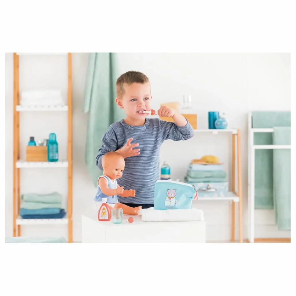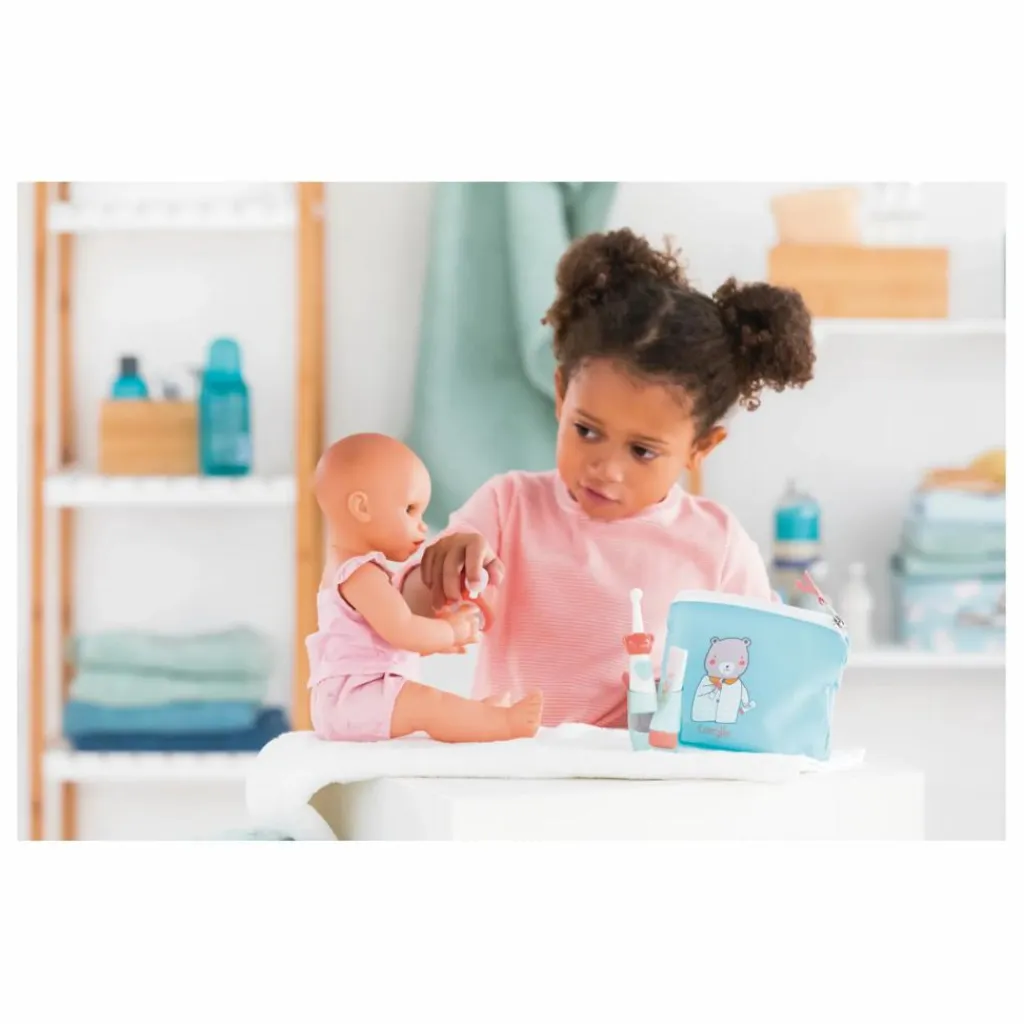 - Contient un lait de toilette, un tube de dentifrice, une brosse à dents électrique factice, un verre et une trousse de toilette