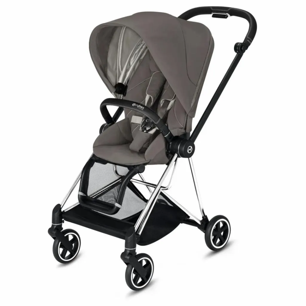 Habillage siège Mios : Dossier en filet, Harnais à une sangle, Inclinaison et pliage d’une main, Suspension intégrale, Siège réversible, Canopy pare-soleil XXL, Repose-jambes réglable.
