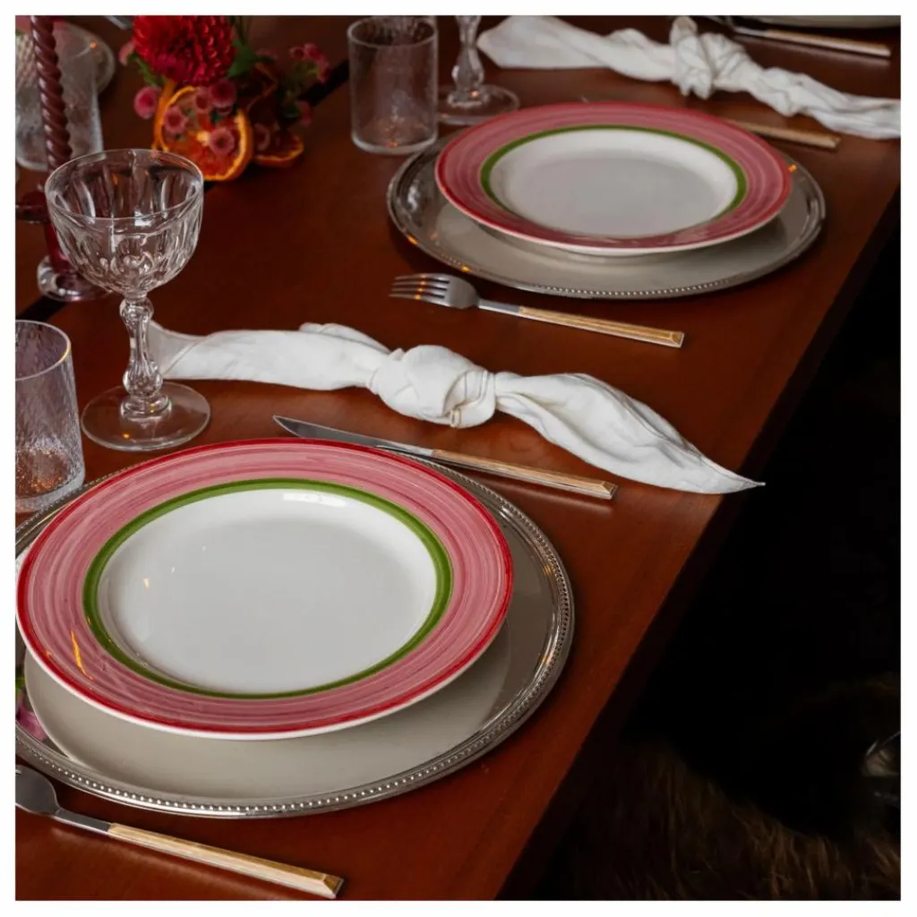 L’assiette à diner Dakota affiche des couleurs rouges, roses et vertes intenses, totalement peinte à la main pour un style intemporel qui la rend parfaite pour un usage quotidien.