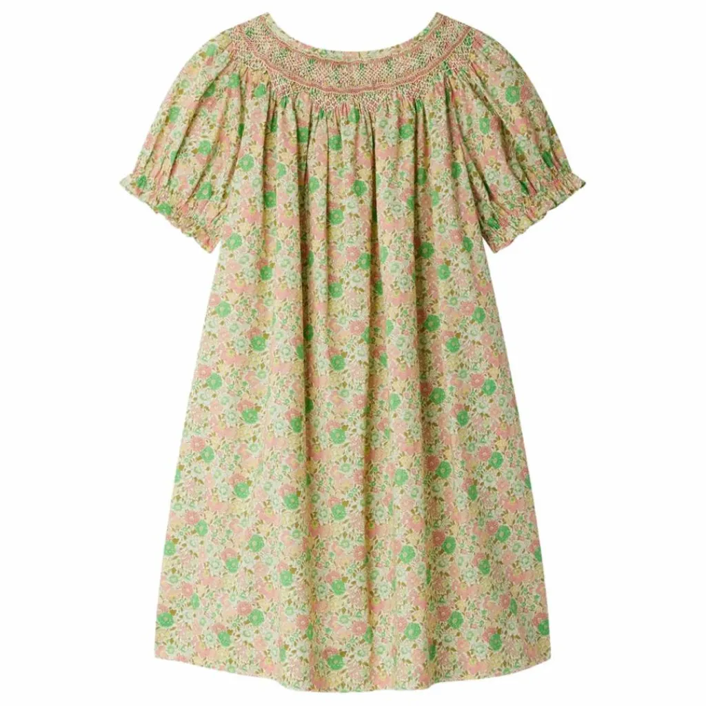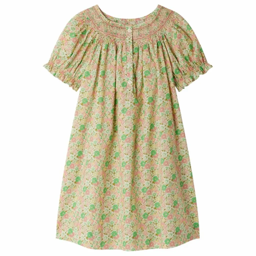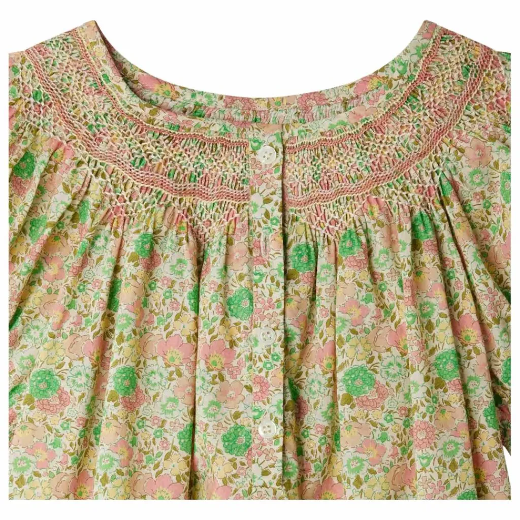 - Confectionnée dans un tissu Liberty à motif floral, cette robe pour fille Jarah apporte une touche de romantisme à la tenue. Ses smocks délicatement brodés au niveau du col ajoutent à son raffinement. Les manches courtes sont élastiquées et se terminent par un petit volant. Ce modèle se ferme à l’aide d’une patte boutonnée discrète.En coton biologiqueCoupe évaséeCol rondManches courtes élastiquées et volantéesFronces sous les smocksCoutures discrètes