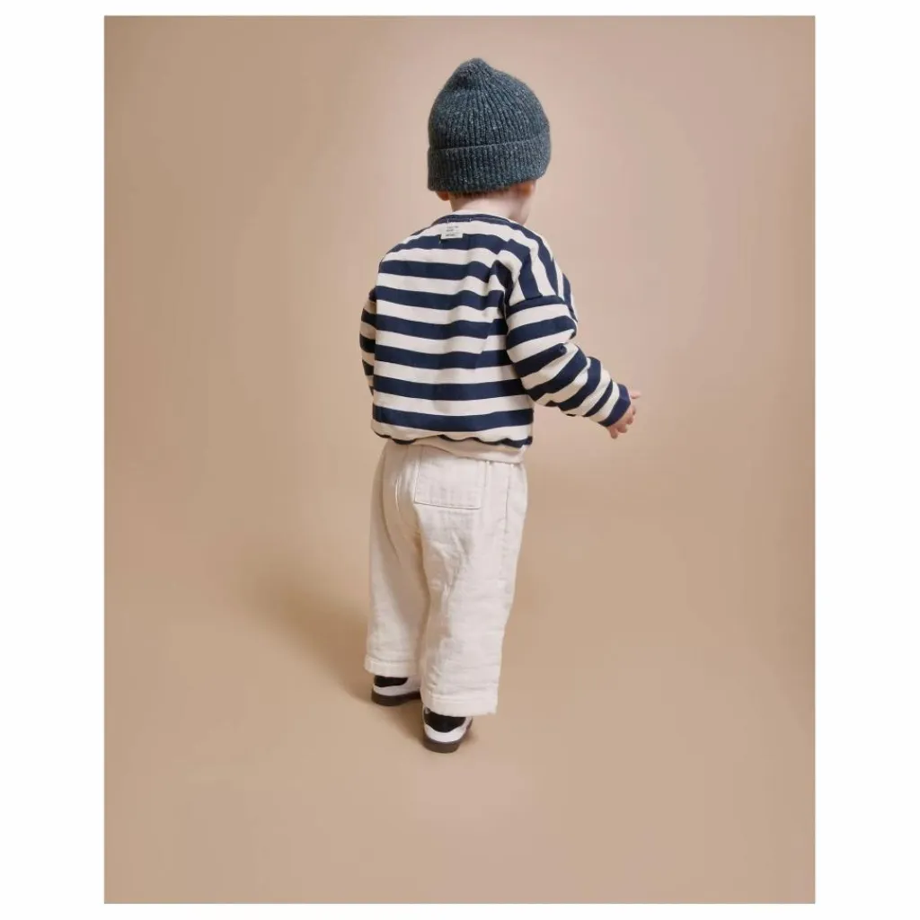 - Sweat-shirt rayé en polaire. Col rond avec insertion en V. Bouton en bois à l’épaule. Etiquette décorative au dos. Finition côtelée.