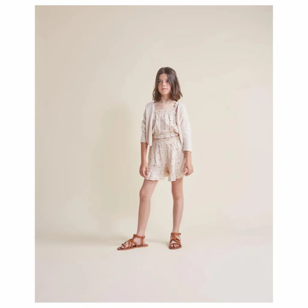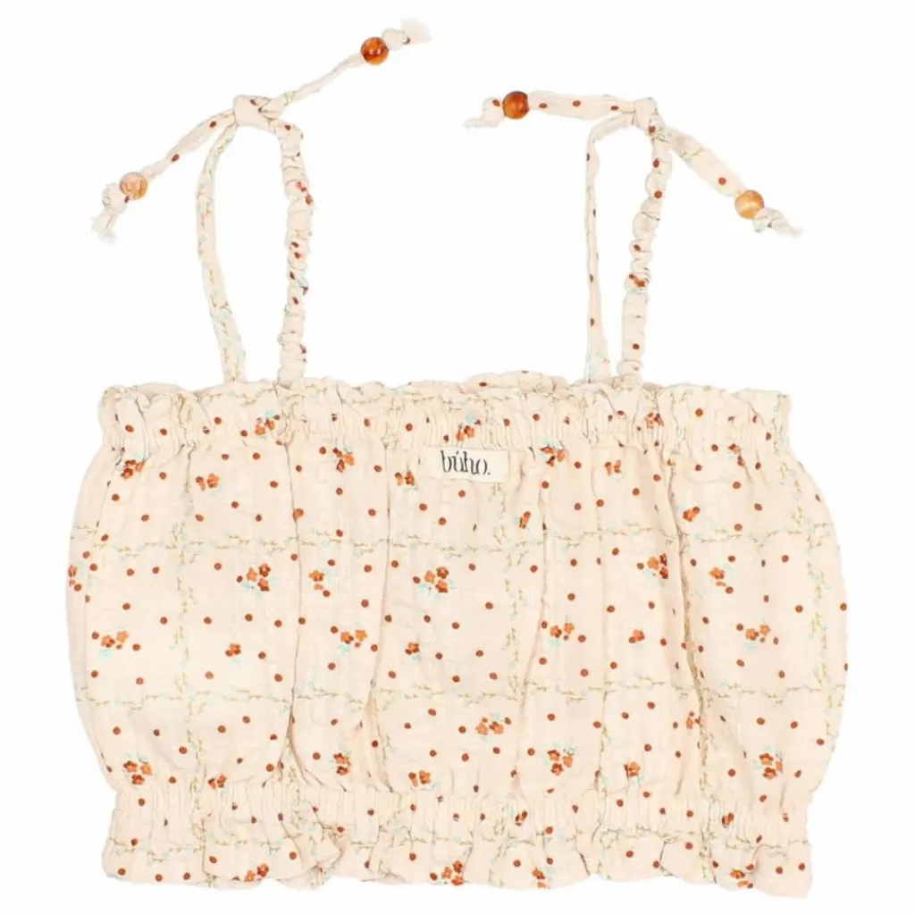 - Top avec imprimé jardin. Encolure droite avec bande élastique. Bretelles élastiques avec boules décoratives. Bandes élastiques à la taille. Finition avec un petit volant.