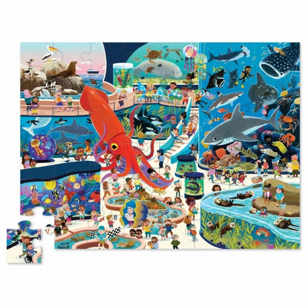 Ce puzzle vous transporte au coeur d’une journée à l’aquarium. Tout est dans l’attention aux détails, en commençant par sa boîte montrant l’extérieur de l’aquarium. Riche en couleurs et en détails, il y a tant de choses à découvrir : baleine, requin, hippocampe,…