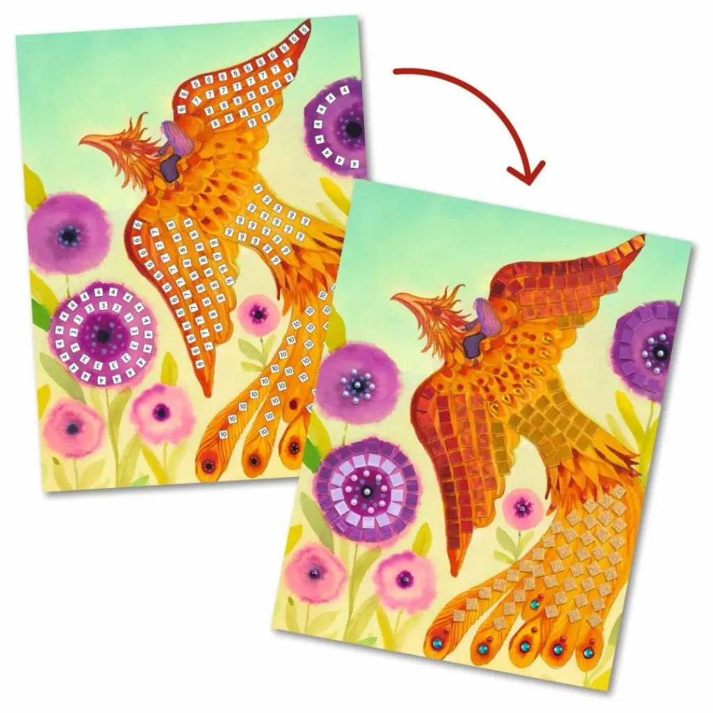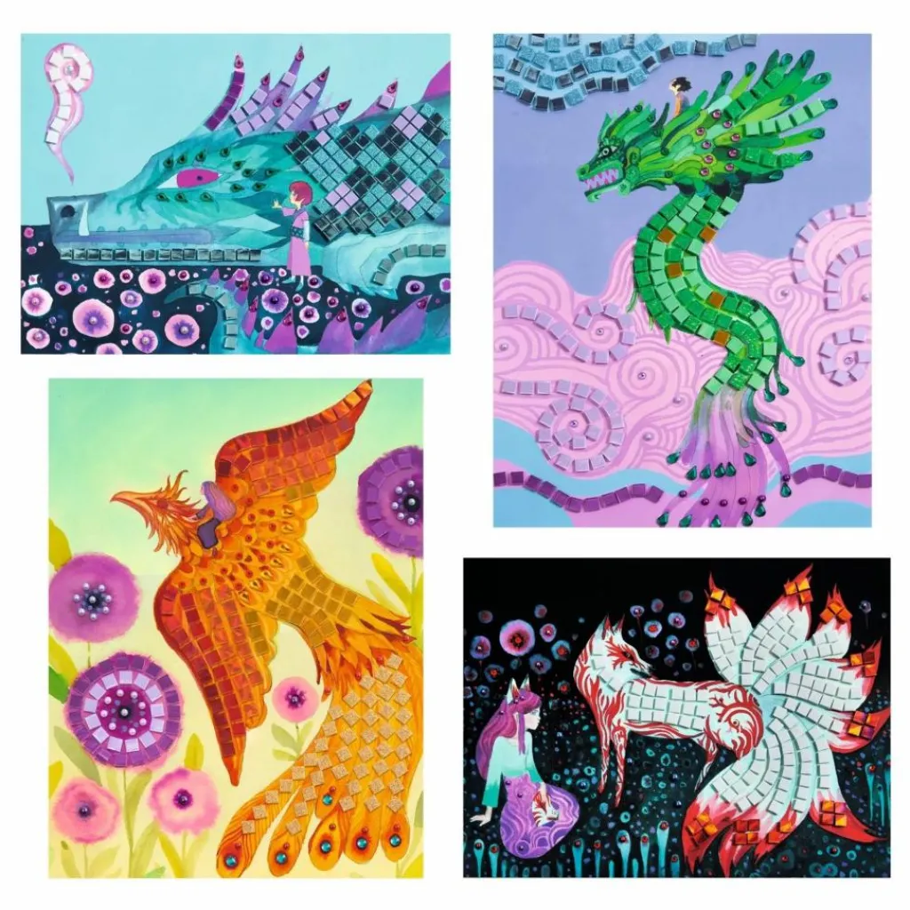 - Un coffret pour s’initier à l’art de la mosaïque. 4 tableaux à compléter avec de petits carrés de mousse pailletée et des strass qui s’utilisent comme des stickers. L’enfant repère les numéros, puis colle les pièces correspondantes à l’emplacement désigné sur la planche. Plumage ou pelage de feu, écailles d’émeraude ou de glace, l’enfant donne vie aux portraits de 4 créatures légendaires.