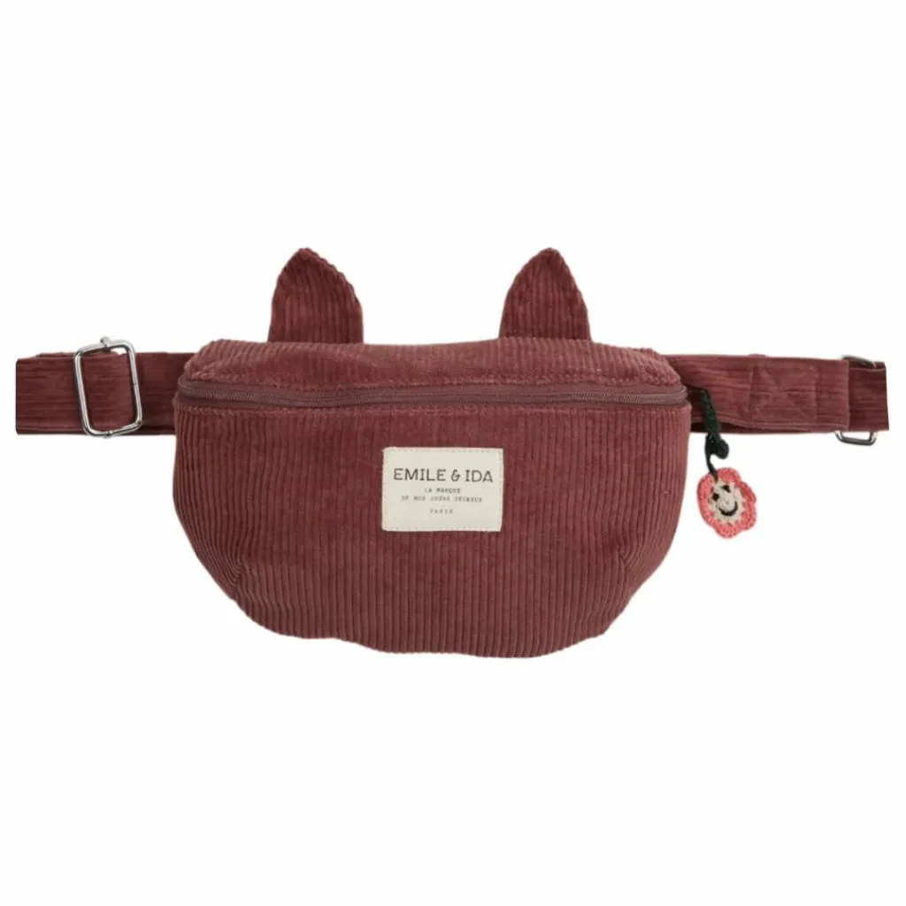 - Banane en velours de coton à grosses côtes caramel. Elle est ornée de deux petites oreilles de chat qui écoutent et gardent secrètes les confidences qui lui sont faites.