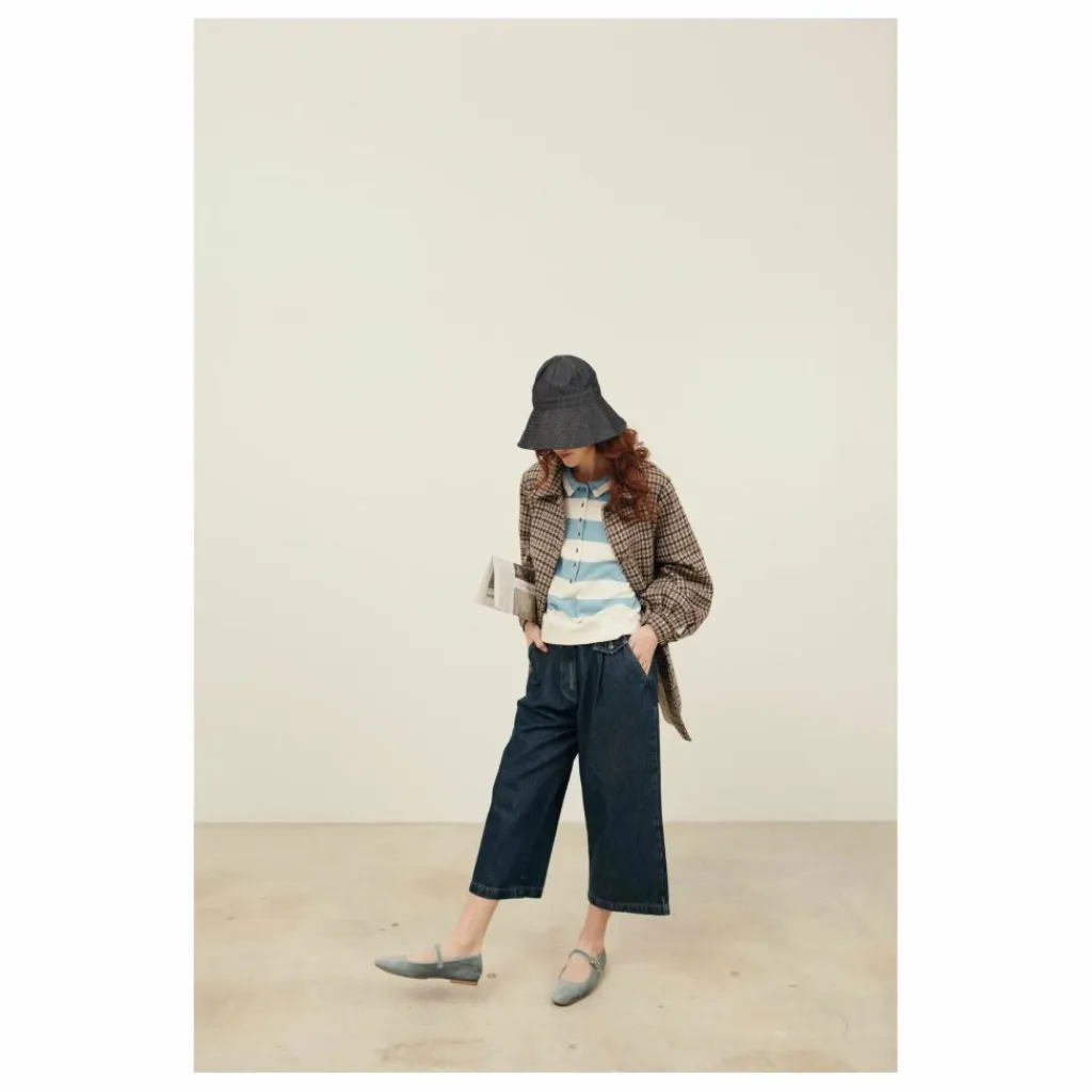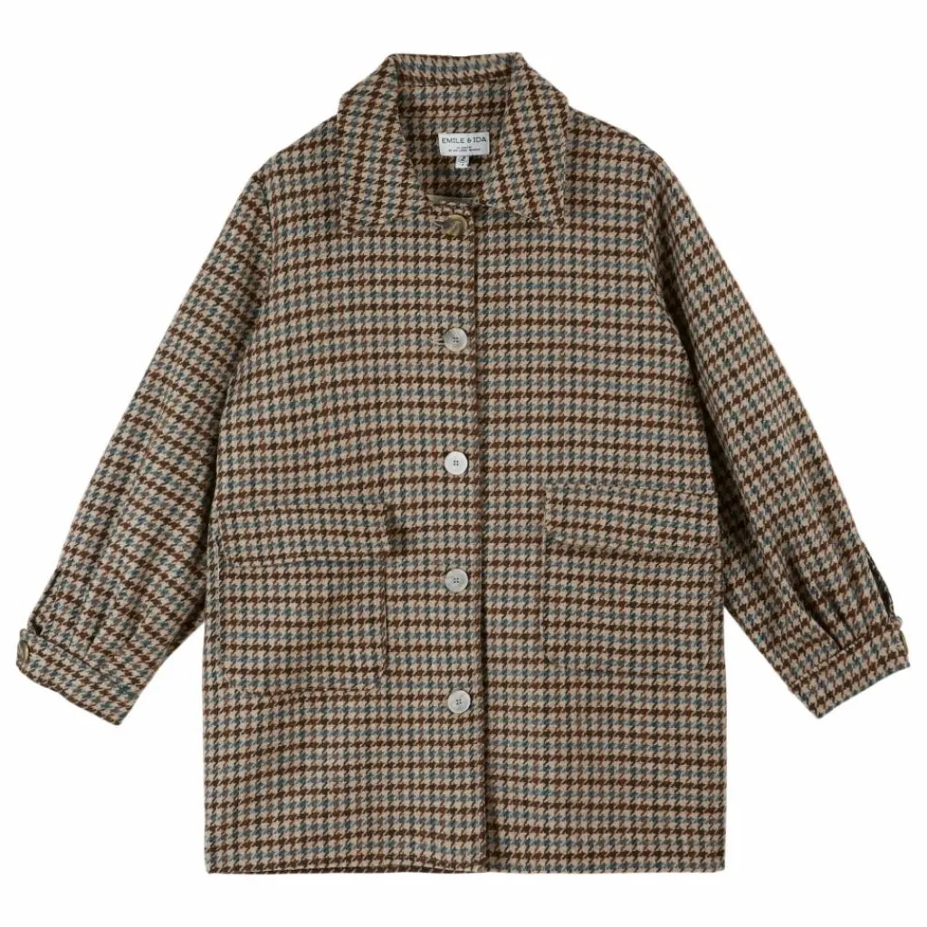 - Manteau 3/4 en laine mélangée à motif pied de coq grège, chocolat et bleu.