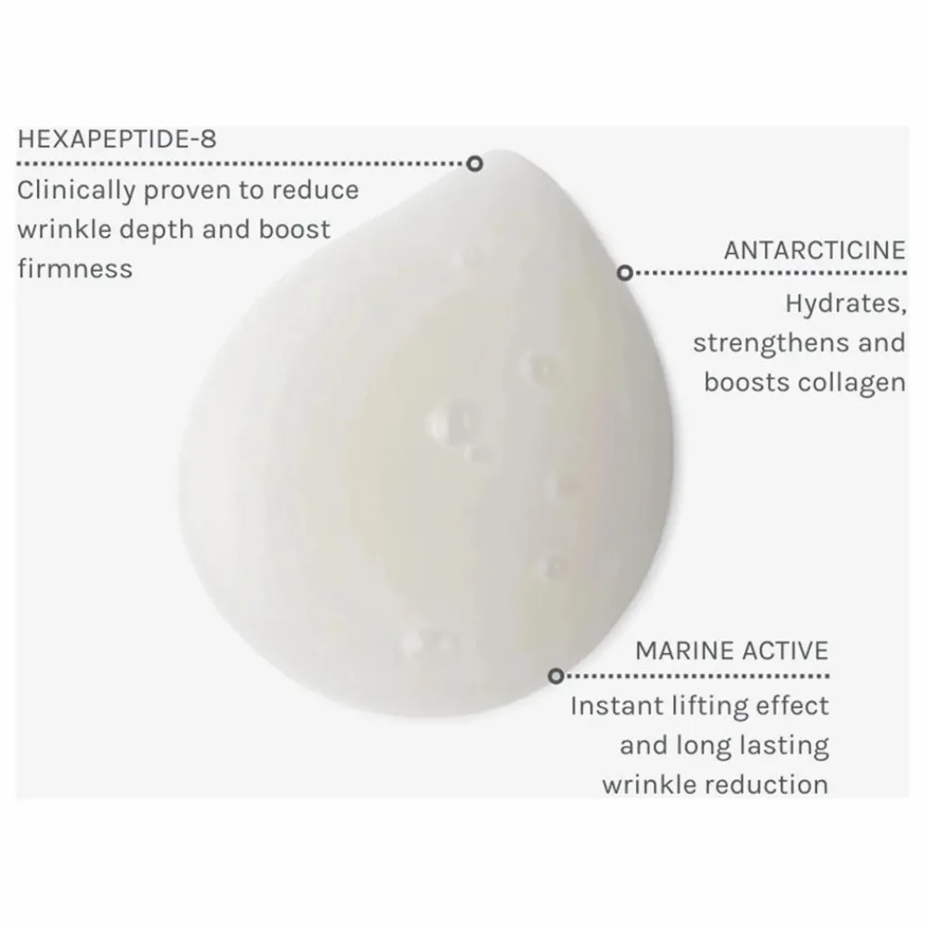 5 % d’ingrédient marin Antarcticine™ renforce et stimule le collagène tout en réduisant la profondeur des rides et en augmentant l’hydratation jusqu’à 45 %.