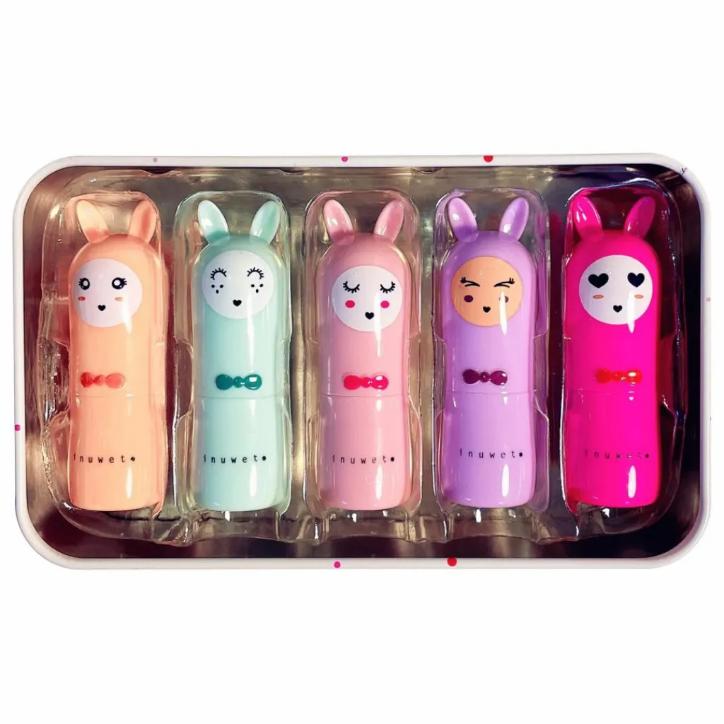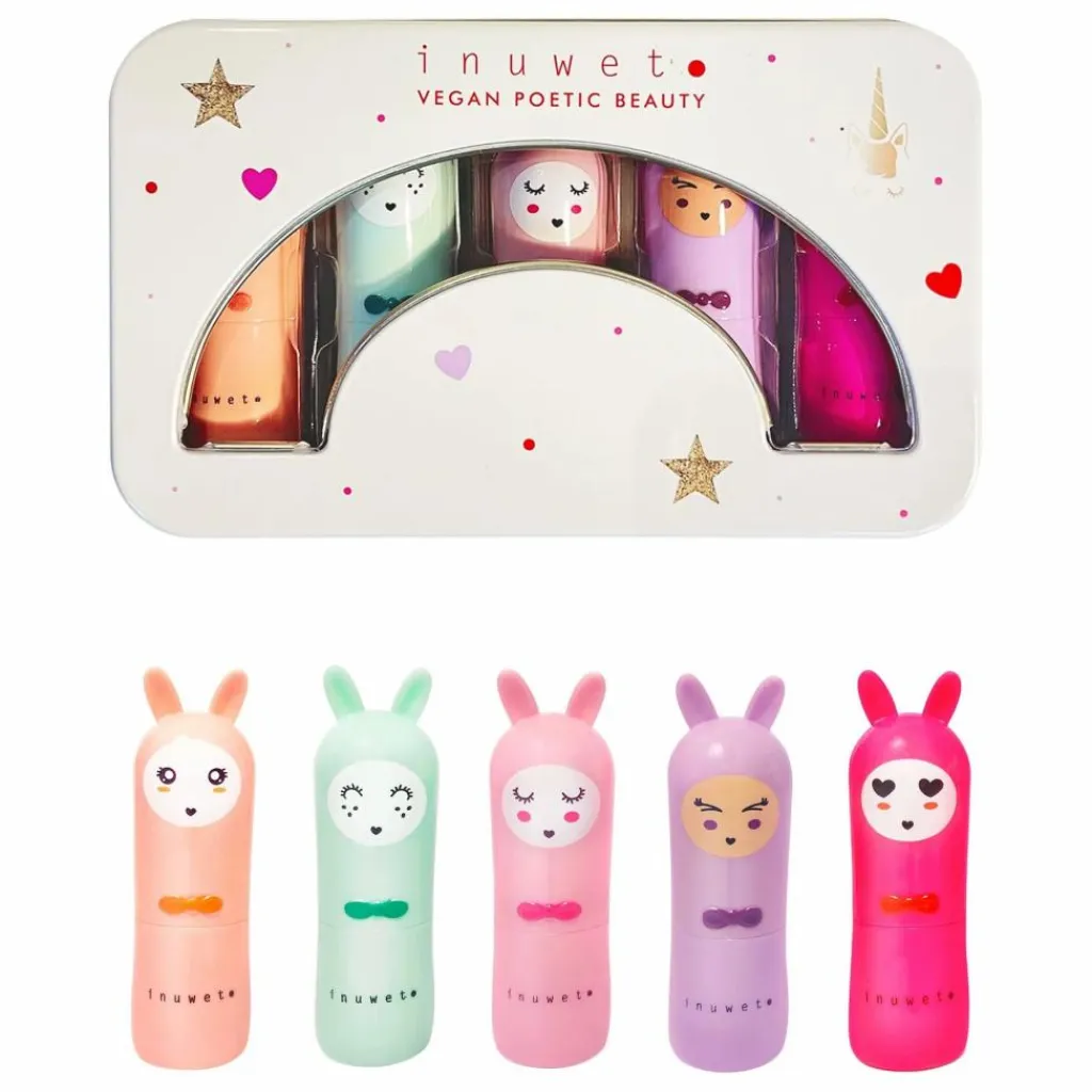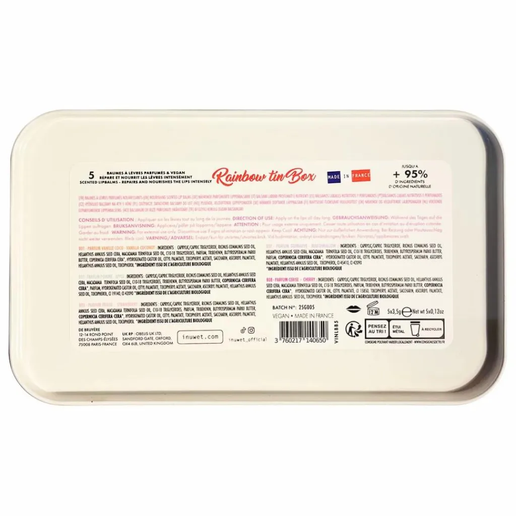 - Coffret de 5 baumes à lèvres parfums Vanille-coco, Pomme, Fraise, Guimauve et Cerise : Le cadeau idéal avec la jolie boite aluminium collector réutilisable.