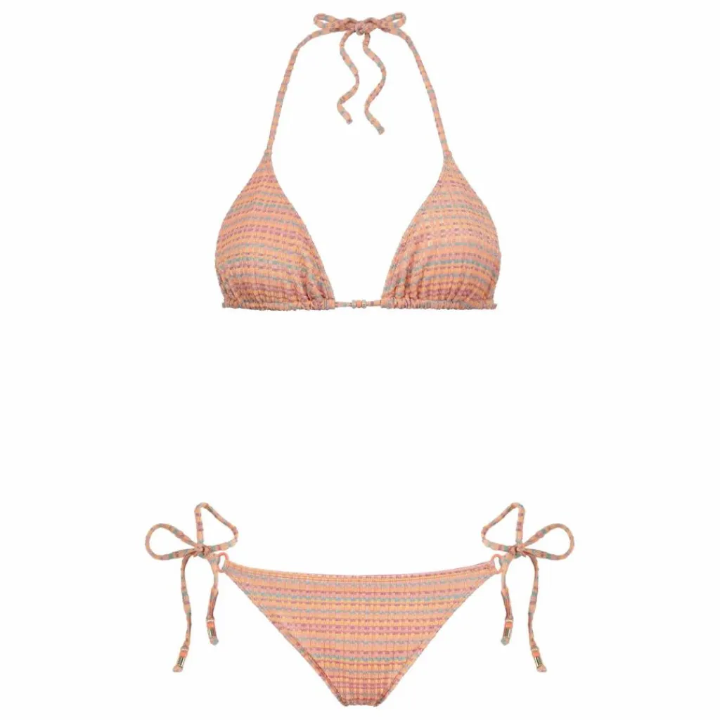 - Bikini triangle “COCO” en tweed corail doublé, orné de bijoux colorés. Pièce couture française alliant féminité, élégance et design haut de gamme, signée Lison Paris.