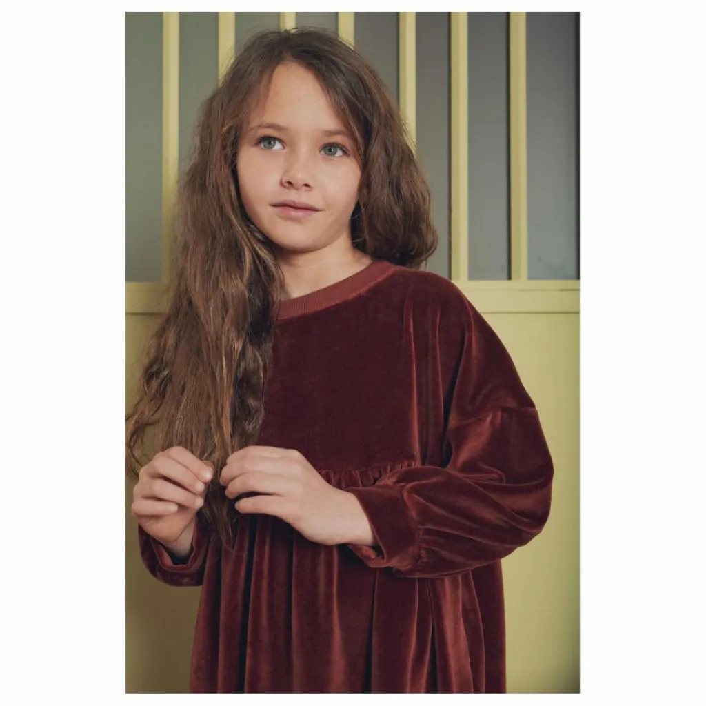 - Une robe fille pleine de chame par son velours tout doux au tombé fluide et sa coupe ample à taille froncée. Une pièce douce et élégante, parfaite pour les fêtes ou pour tous les jours avec des collants .