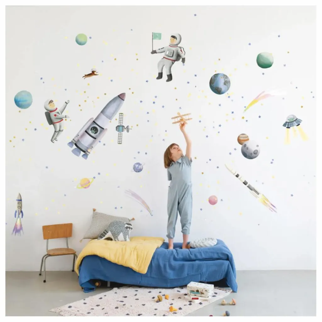 Vers l’infini et au-delà ! S’endormir en rêvant de décoller vers les étoiles, visiter les planètes, rencontrer les martiens … Le voyage commence avec ce sticker géant ! La composition des éléments est adaptable à la surface disponible sur le mur.