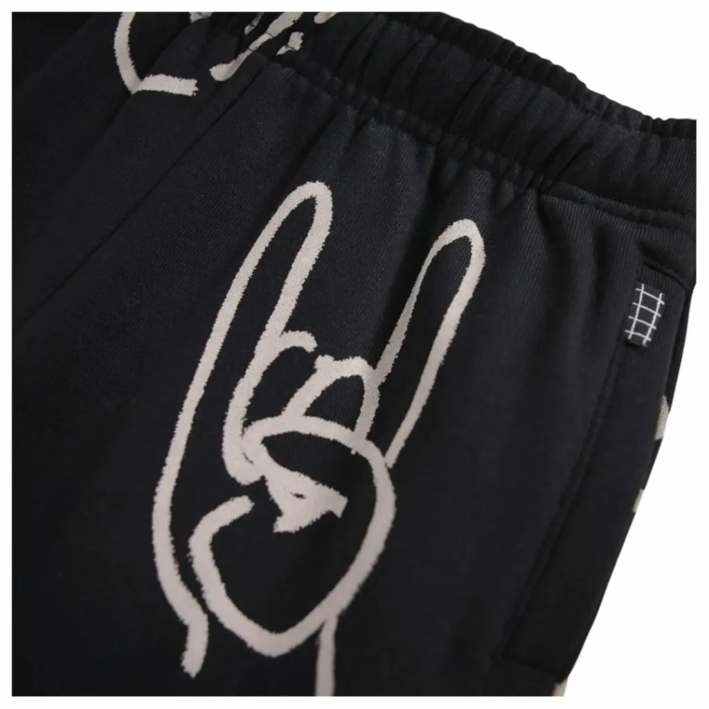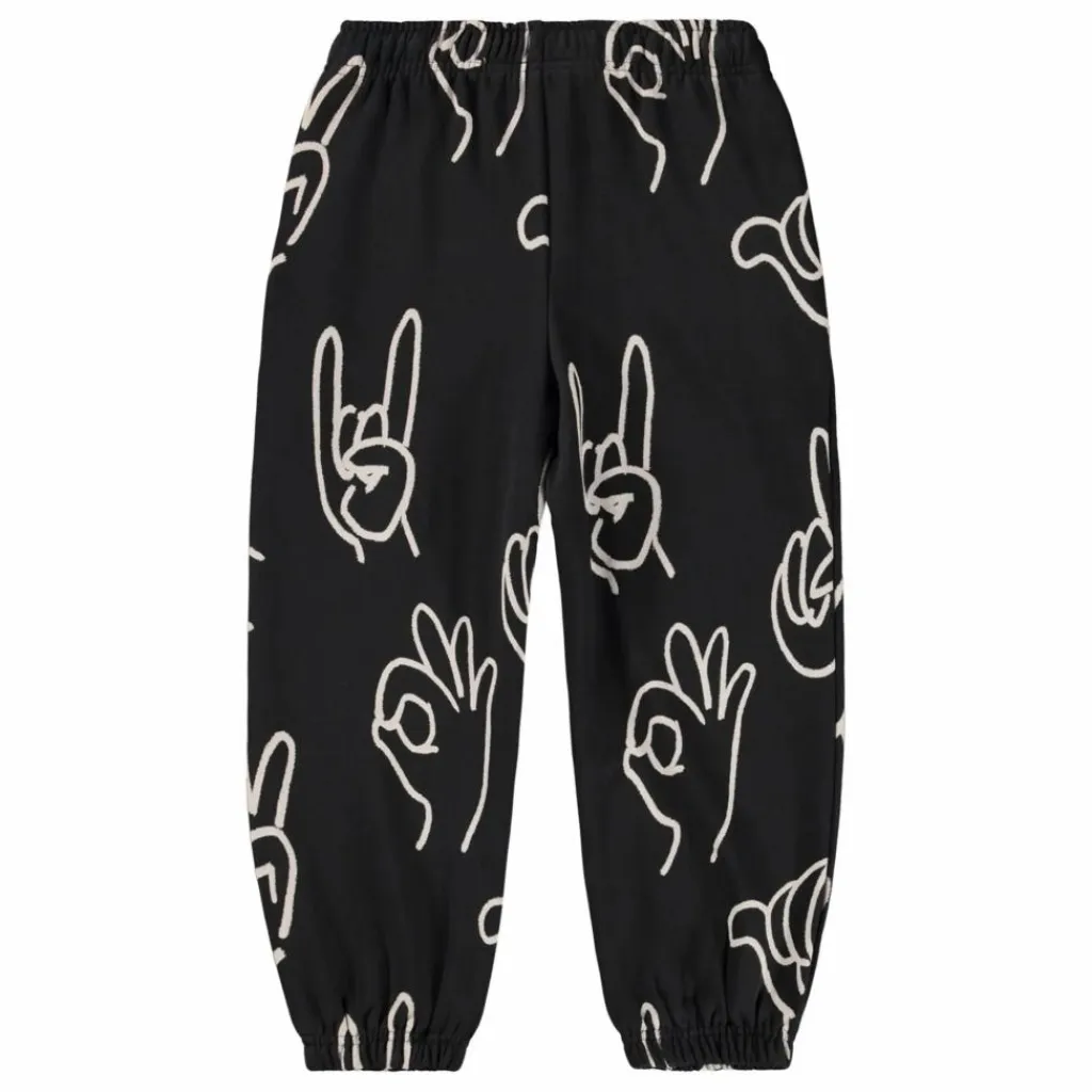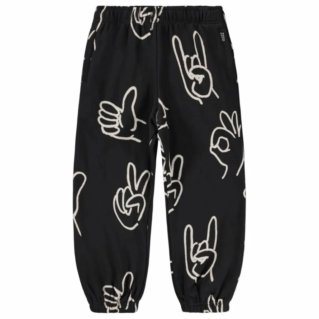 - Ce pantalon de survêtement noir de Molo est fabriqué en coton biologique et comporte une taille élastique, un cordon de serrage intérieur, un élastique au niveau des chevilles et des poches latérales. Le pantalon de survêtement a une coupe régulière et est décoré d’un imprimé blanc représentant divers signes de la main.