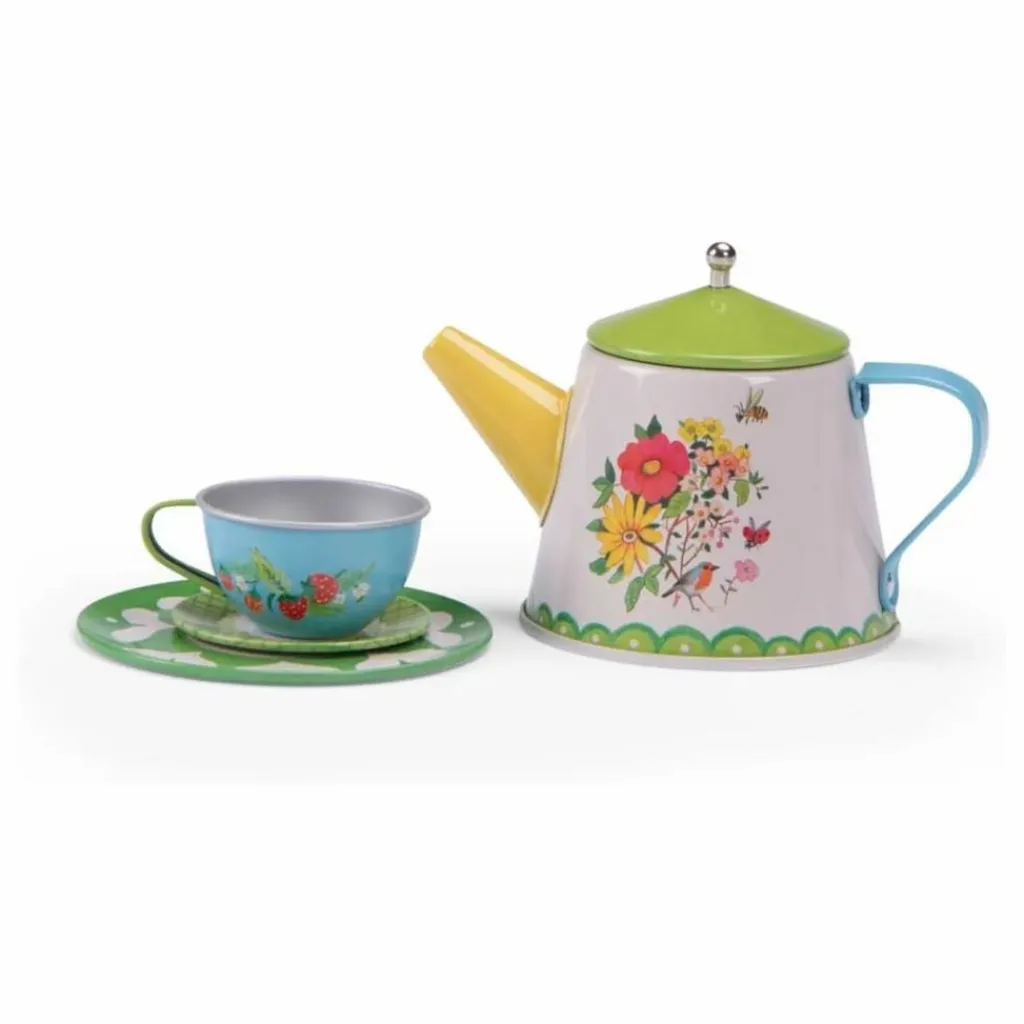 - Valise service à thé en métal aux couleurs printanières, joliment illustrée sur le thème du pique-nique par Camille Jourdy. Elle comprend un plateau, une théière, quatre assiettes à dessert, quatre tasses et leurs soucoupes assorties.