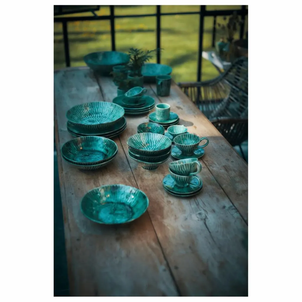- Pour son dernier livre « Eén Pan », Naessens n’a pas seulement pris la plume, elle est aussi retournée dans son atelier de céramique. Elle a personnellement créé la collection « Verde Lanza », désormais produite en exclusivité par Serax. Le nom fait référence à l’île de Lanzarote, où Naessens réside souvent. Elle s’y est inspirée du vert des fenêtres et des portes en bois, ainsi que des rares plantes qui se détachent sur le paysage lunaire noir. Le vert délavé par le soleil – une teinte qui se marie à merveille avec tout ce qui est délicieux – est rehaussé par la texture en forme de coquillage que Naessens a appliquée avec ses doigts. En bref : cent pour cent Pascale et autant de soleil.