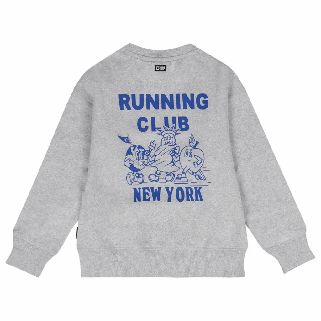 - Ce pull doux et gris clair se distingue par un imprimé humoristique bleu vif au dos et le texte « Running Club New York ». Une icône subtilement touffetée apparaît sur le devant. Sa coupe légèrement surdimensionnée en fait un choix décontracté et confortable pour tous les jours.