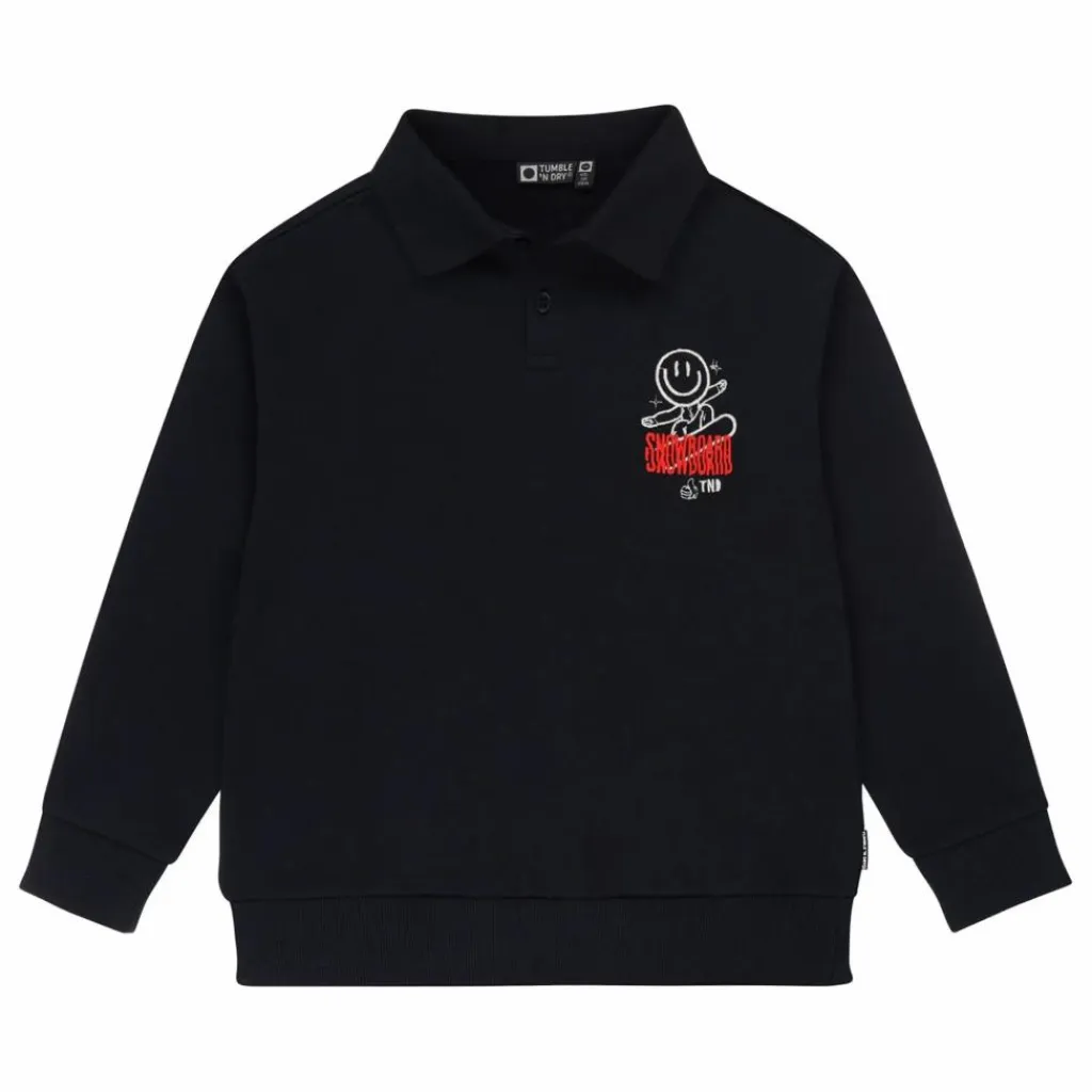 - Ce pull doux et surdimensionné à col polo est doté de poignets côtelés et d’une broderie smiley sur la poitrine.