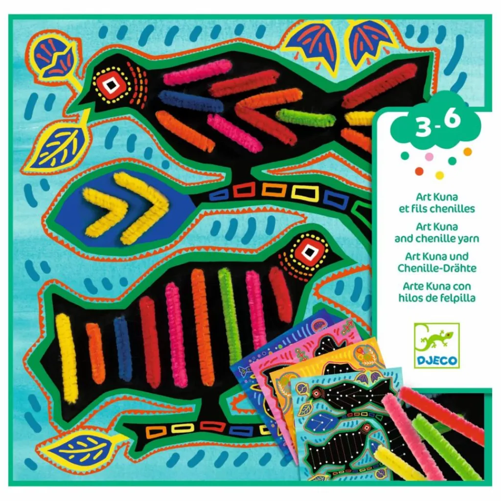 Une activité manuelle d’enfilage avec de nombreux fils chenille. En suivant les indications du livret explicatif, votre enfant passe les fils chenille dans les gros trous des cartes. Une fois la carte remplie, elle devient un magnifique tableau coloré inspiré de l’art Kuna d’Amérique du Sud !
