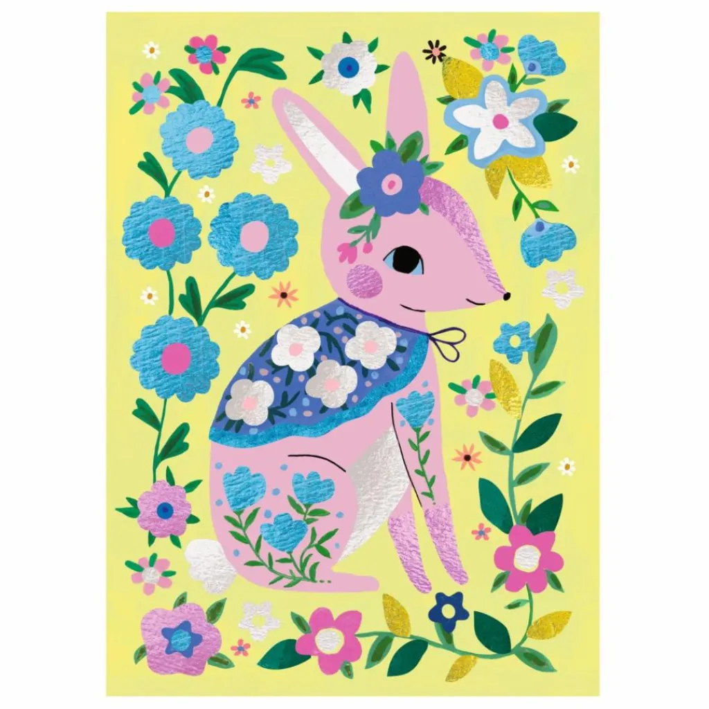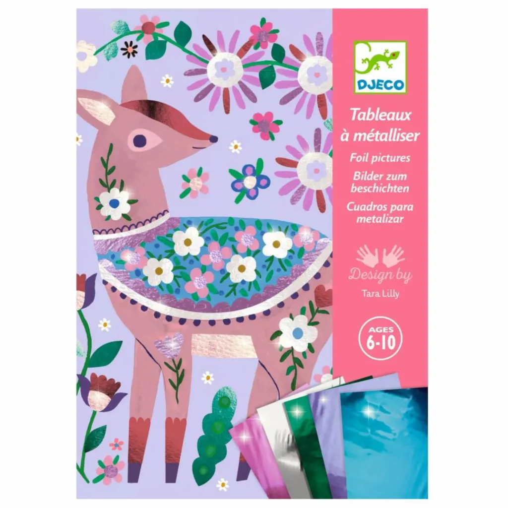 4 adorables animaux à décorer avec des feuilles métallisées. Grâce au code couleurs indiqué sur les planches, votre enfant repère les zones à métalliser. À l’aide de l’outil, il ôte la pellicule protégeant la surface encollée puis y dépose la feuille métallisée. La matière se dépose comme par magie et les tableaux s’illuminent.