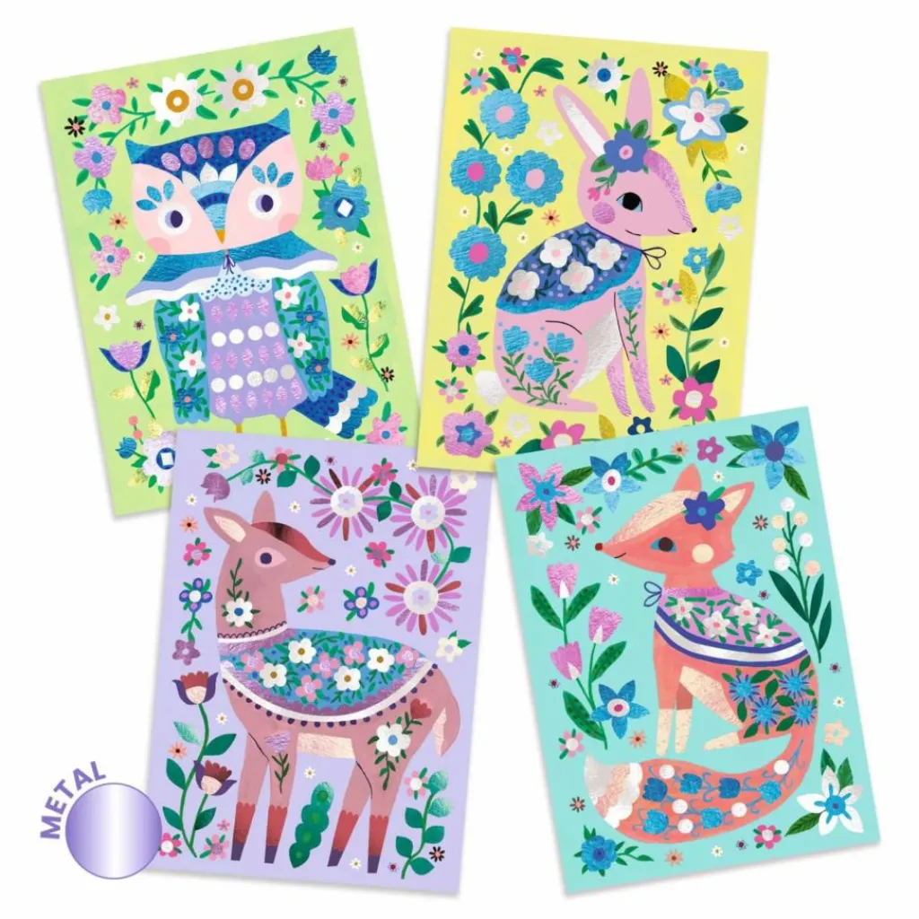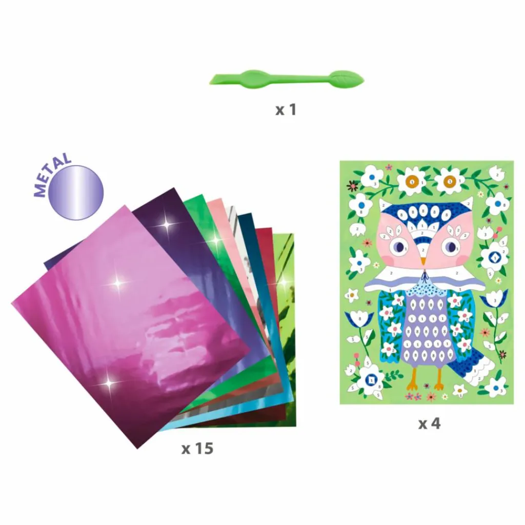 - 4 cartes illustrées et préencollées (15 x 21 cm), 15 feuilles de métal à déposer, 1 outil de plastique pour dévoiler les surfaces encollées, 1 livret d’explications pas à pas en couleurs