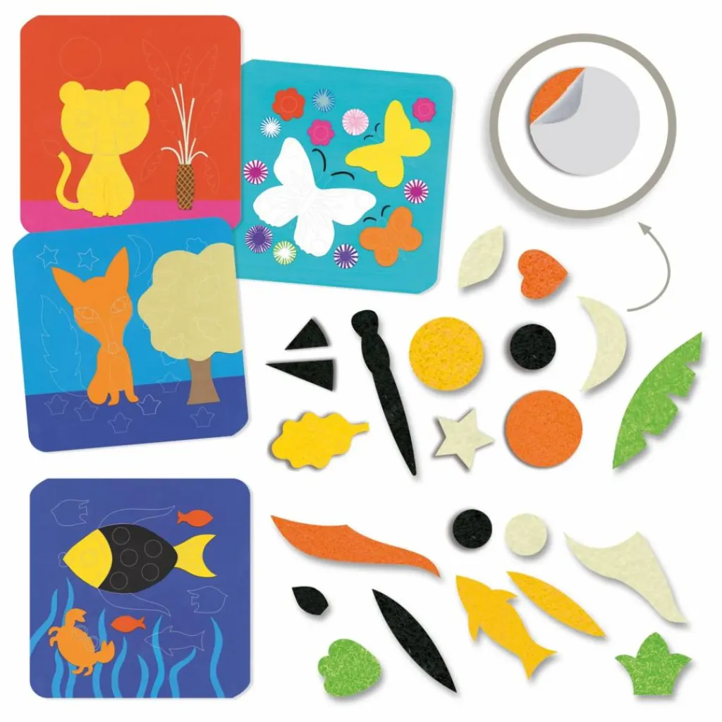 - Une activité de collage pour réaliser 4 tableaux avec des gommettes toutes douces en feutrine. En suivant le livret explicatif, l’enfant assemble et superpose les gommettes de feutrine pour composer 4 tableaux « animaux » doux et colorés.