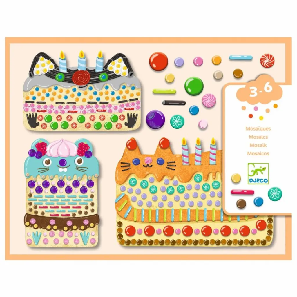 Une activité de collage pour créer des gâteaux trop mignons et s’initier à la mosaïque. En suivant le livret explicatif, l’enfant colle les gommettes colorées et illustrées pour décorer 3 délices silhouettés.
