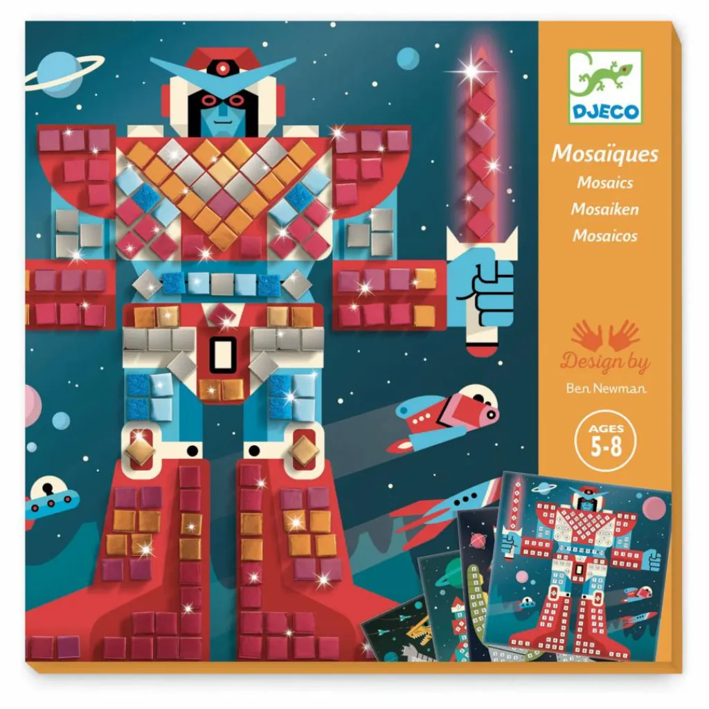 Un coffret pour s’initier à l’art de la mosaïque, où les robots affrontent de terribles monstres. 4 tableaux à compléter avec de petits carrés de mousse métallisée qui s’utilisent comme des stickers. Votre enfant repère les numéros puis colle les pièces correspondantes à l’emplacement désigné sur la planche. Les tableaux se remplissent et les personnages prennent vie.