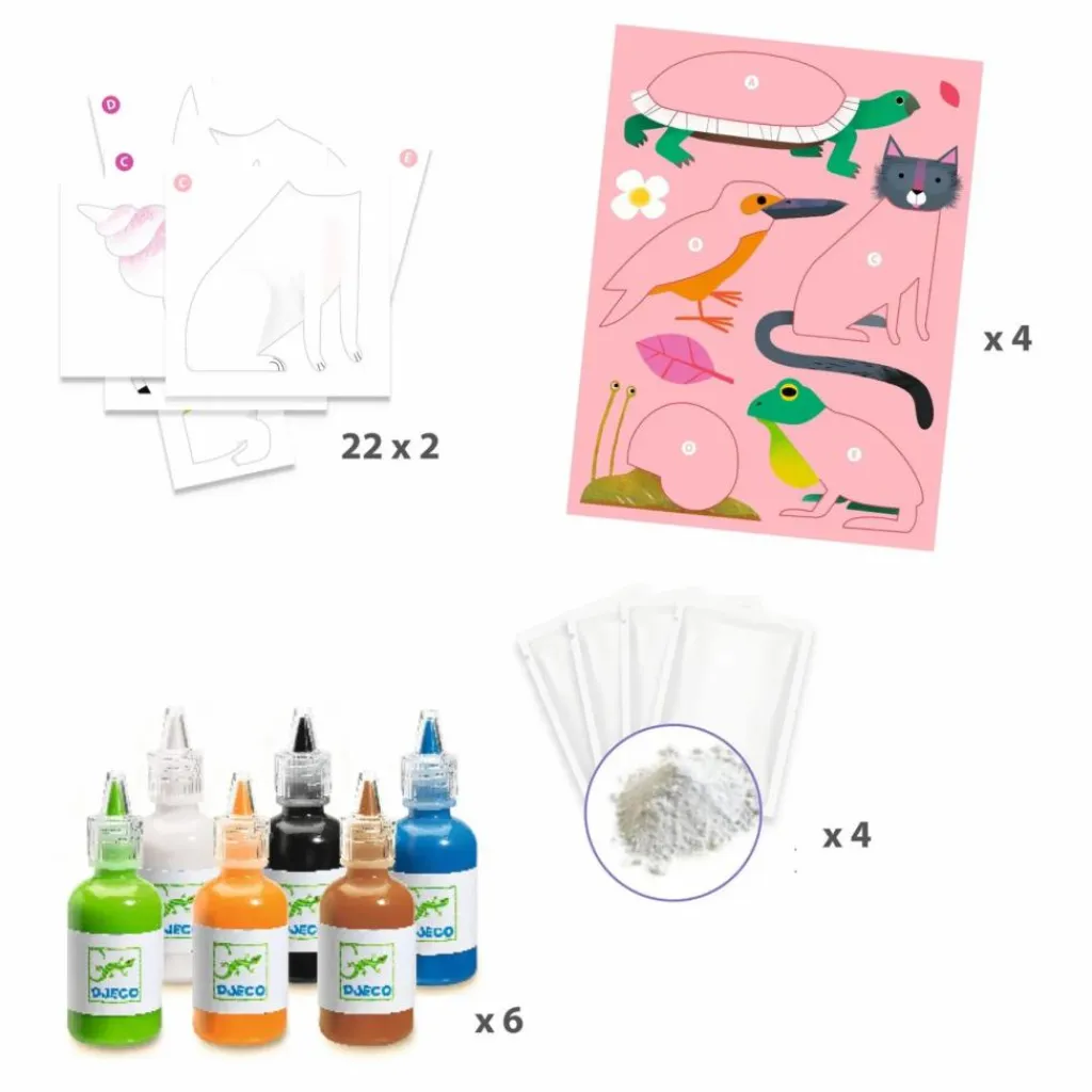 « Colorful » est une activité pour apprendre à marbrer le papier avec des encres colorées. Votre enfant complète les animaux des 4 tableaux avec des stickers qu’il a lui-même « imprimés ». Il verse les encres goutte à goutte puis les mélange : les couleurs s’entrelacent sans se brouiller. Il dépose ensuite les autocollants à la surface du bain pour transférer les motifs sur le papier. Les motifs créés se transfèrent sur le papier comme par magie !