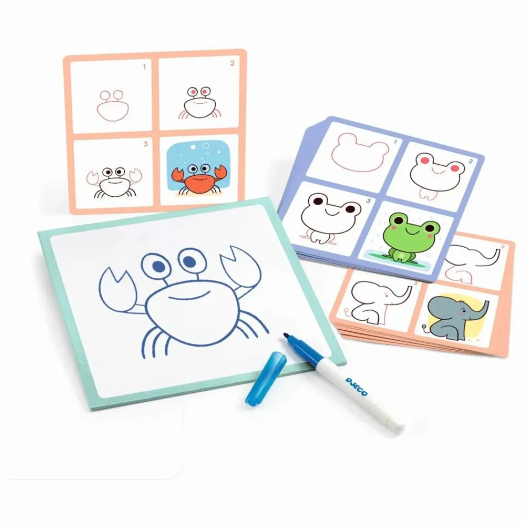 - Apprendre à dessiner des bébés animaux grâce à cette activité pas à pas ! Des cartes modèle pour guider l’enfant à chaque étape du dessin. Il recommence autant de fois qu’il le souhaite avec le feutre effaçable. Une activité pour apprendre à dessiner en s’amusant.