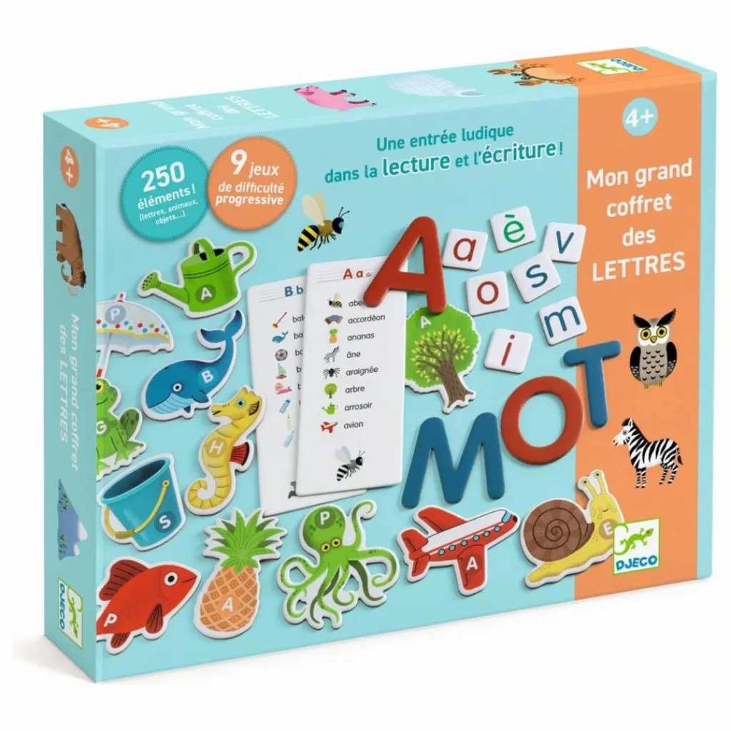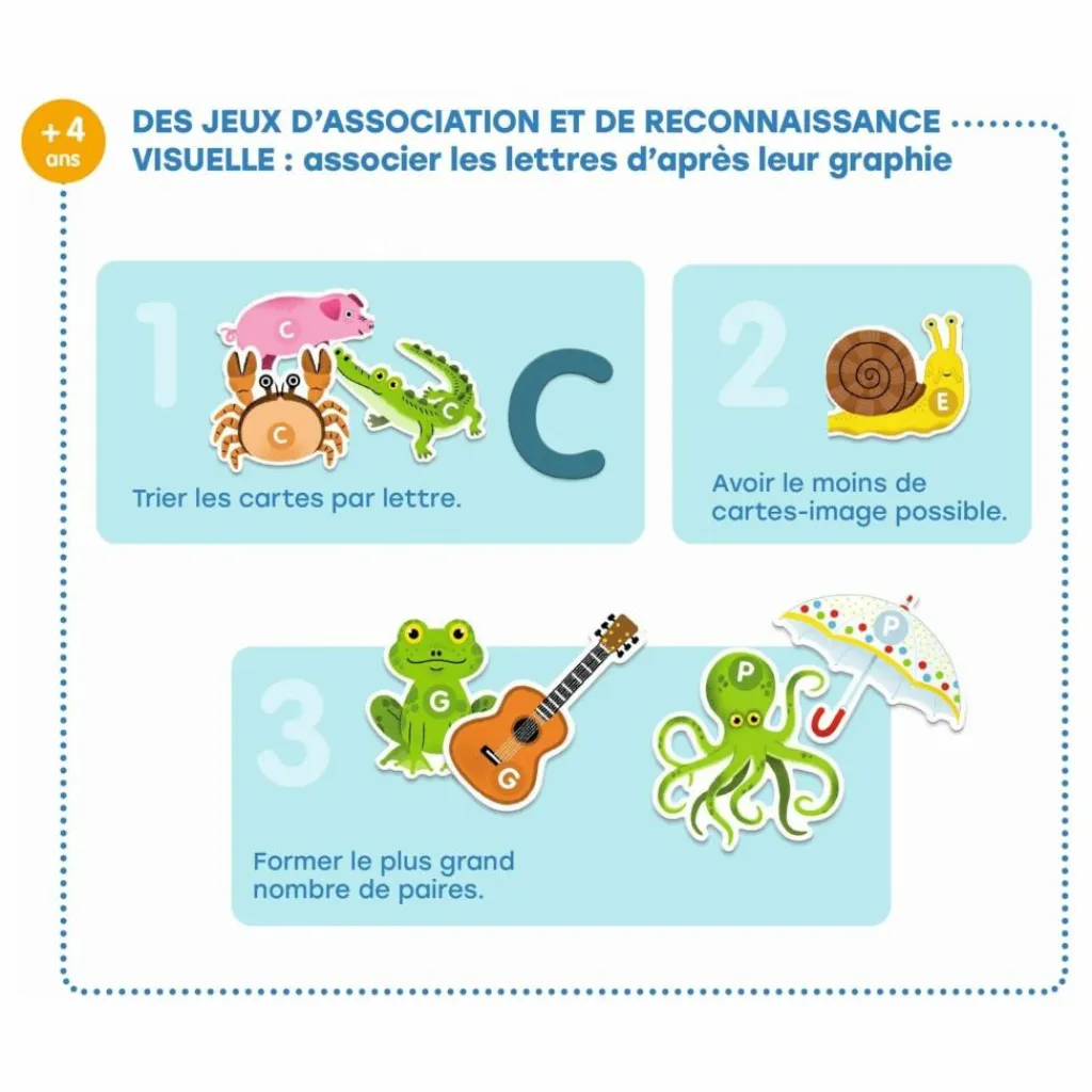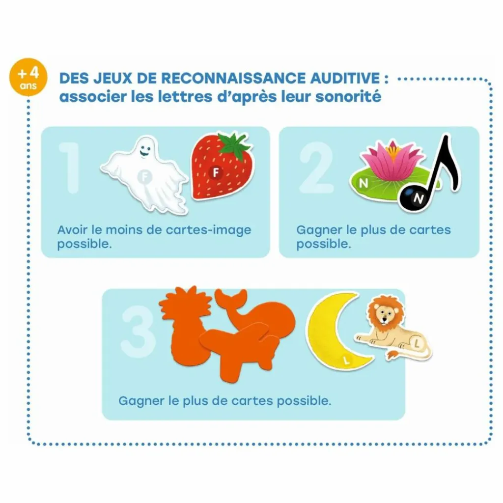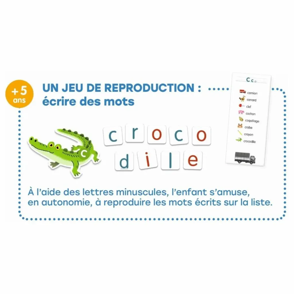 - VENTE PAYS FRANCOPHONES UNIQUEMENT. Ce grand coffret propose 9 jeux de difficulté croissante pour apprendre l’alphabet de façon ludique… pour jouer seul ou à plusieurs À son rythme, l’enfant nomme les objets, reconnaît la graphie et le son des lettres, puis écrit des mots. Il intègre la notion de sens de l’écriture et de la lecture.